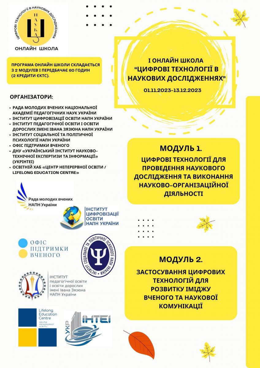 01 листопада 2023 р відбулося відкриття онлайн-школи. Модератор заходу ‑ Анна Яцишин, доктор педагогічних наук, старший науковий співробітник, провідний науковий співробітник Інституту цифровізації освіти НАПН України, заступник голови Ради молодих вчених НАПН України.