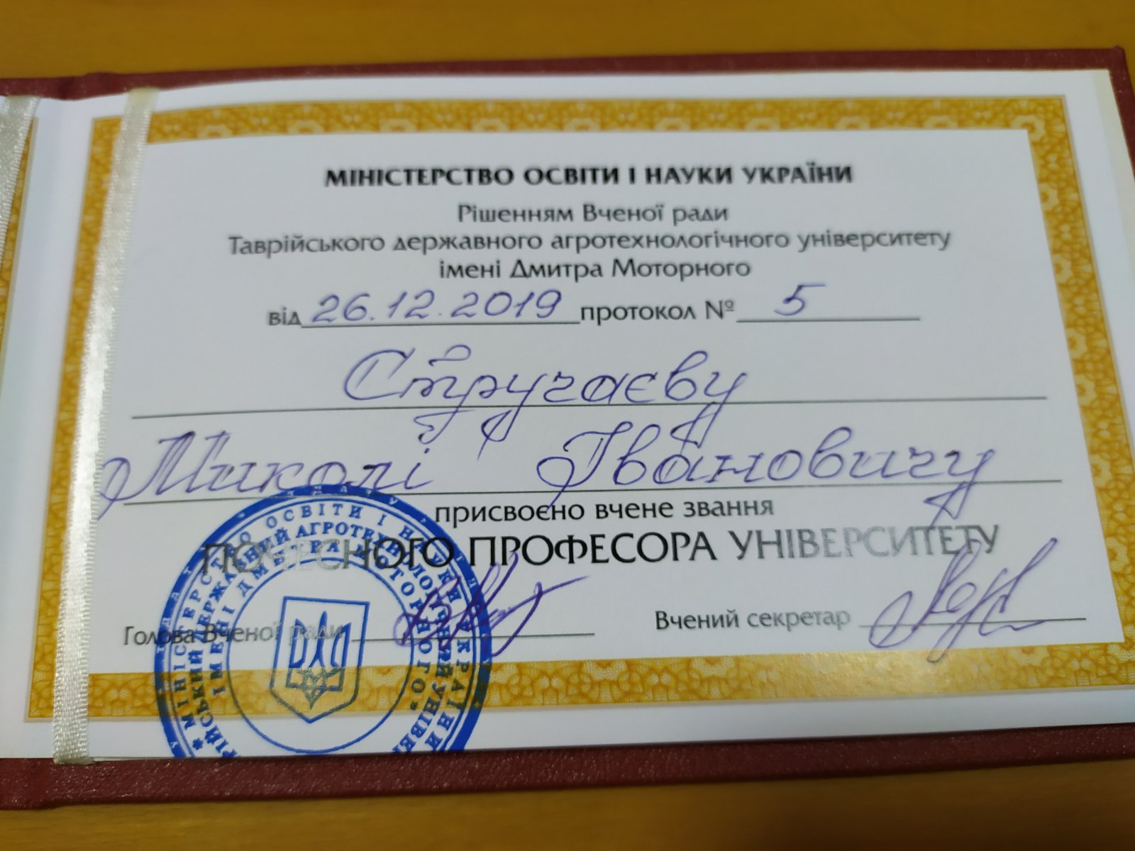 За рішенням Вченої ради Таврійського державного агротехнологічного університету імені Дмитра Моторного доценту кафедри електротехнологій і теплових процесів Стручаєву Миколі Івановичу було присвоєно вчене звання Почесного професора університету.