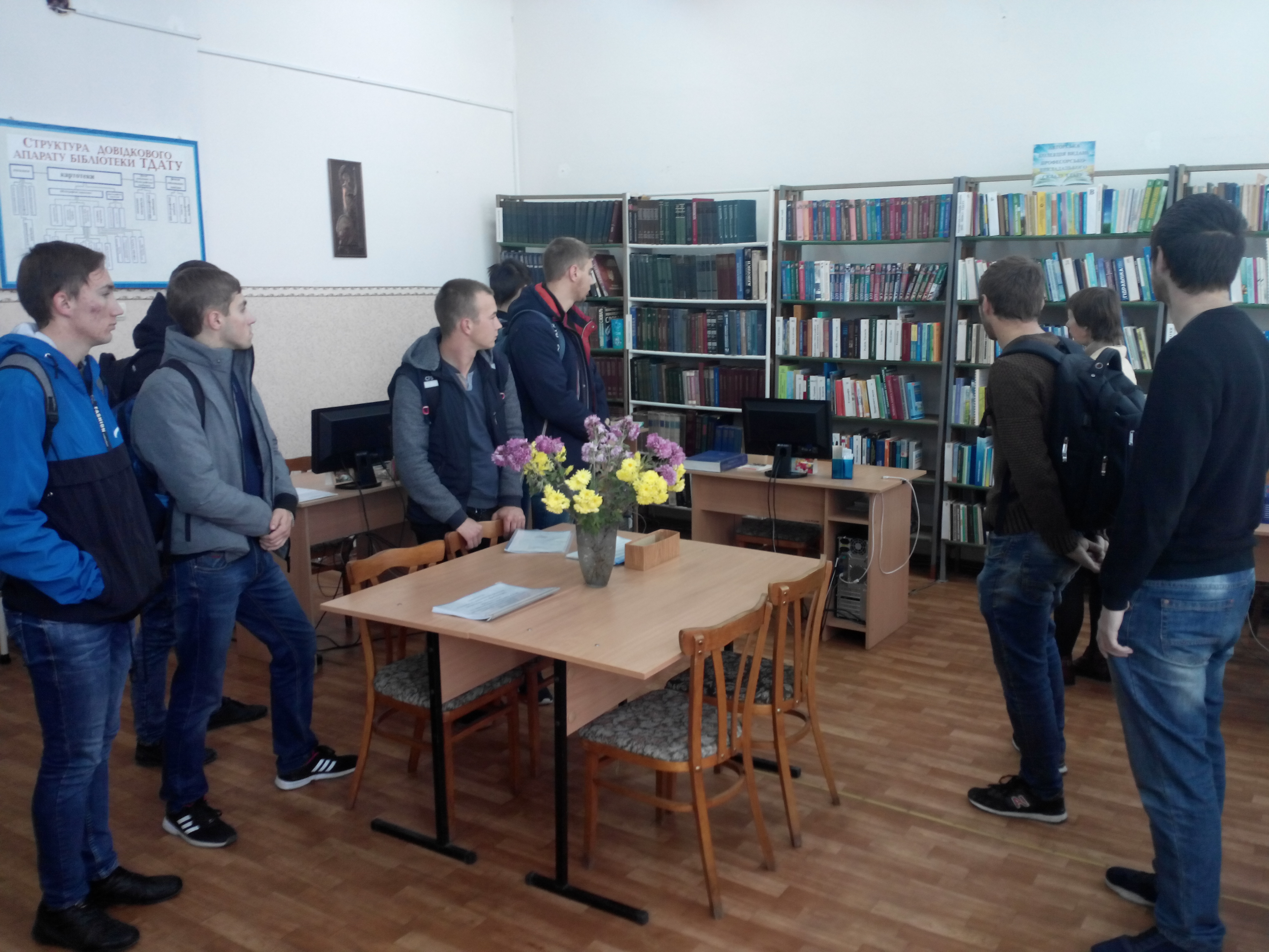 Знайомство студентів з бібліотекою, яка складається з чотирьох відділів, в яких працюють кваліфіковані фахівці почалося з відділу обслуговування користувачів, де їм видаватиметься уся необхідна для навчання література. У відділі науково-бібліографічної роботи студентам показали, як користуватися традиційним каталогом, шукати літературу по потрібній темі, на що особливо звертати увагу при пошуку. Відділ інформаційних технологій та комп’ютерного забезпечення надає можливість доступу до власних і віддалених електронних ресурсів всім категоріям користувачів бібліотеки.
