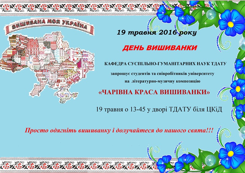 19 травня 2016 року – ДЕНЬ ВИШИВАНКИ – свято національної єдності! Просто одягни вишиванку, де б ти не був, і щоб не робив. Долучися  до загальнонаціонального свята!