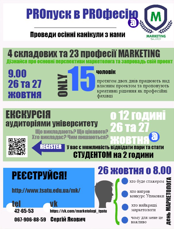 26 та 27 жовтня о 9.00 відбудеться цікавий семінар-тренінг, о 12.00 – екскурсія аудиторіями університету. Реєстрація з 8.00.