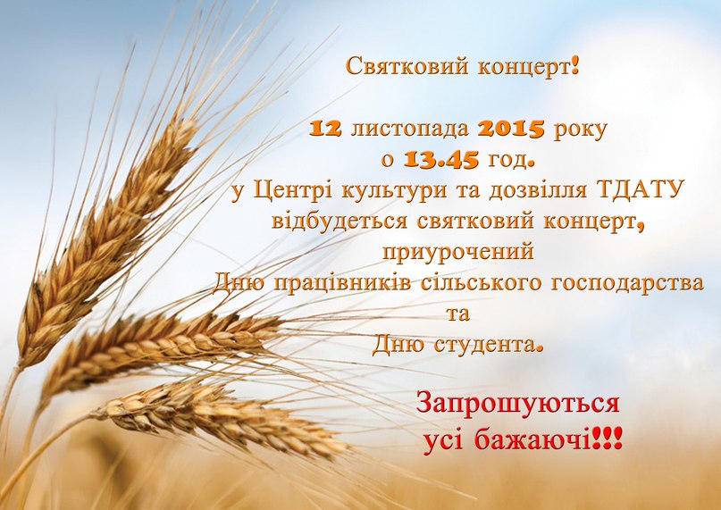12 листопада 2015 року о 13.45 год. у Центрі культури та дозвілля ТДАТУ відбудеться святковий концерт, приурочений Дню працівників сільського господарства та Дню студента.