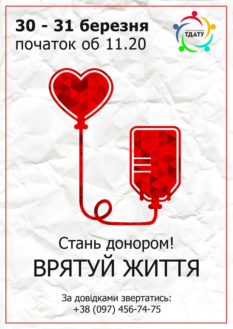 30 та 31 березня 2016 в нашому університеті проводиться благодійна акція «ЗДАЙ КРОВ – ВРЯТУЙ ЖИТТЯ!». В рамках акції кожен бажаючий може здати свою кров в студентський фонд ТДАТУ. При собі треба мати паспорт, ідентифікаційний код й студентський квиток. Маса тіла донора повинна бути не менше 55кг.