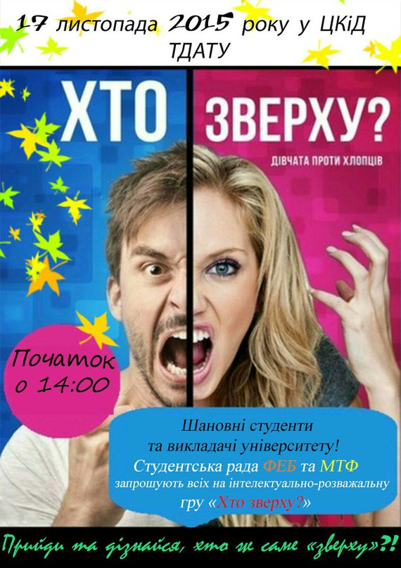 17 листопада 2015 року о 14.00 у Центрі культури та дозвілля ТДАТУ відбудеться інтелектуально-розважальна гра “Хто зверху?”