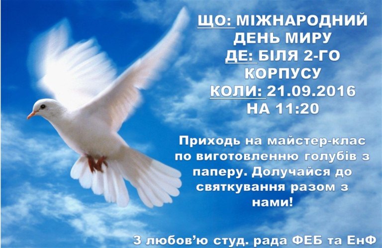 21.09.2016 року об 11.20 біля ІІ корпусу відбудеться Міжнародний день миру. Запрошуємо усіх бажаючих долучитися до заходу студентського активу!
