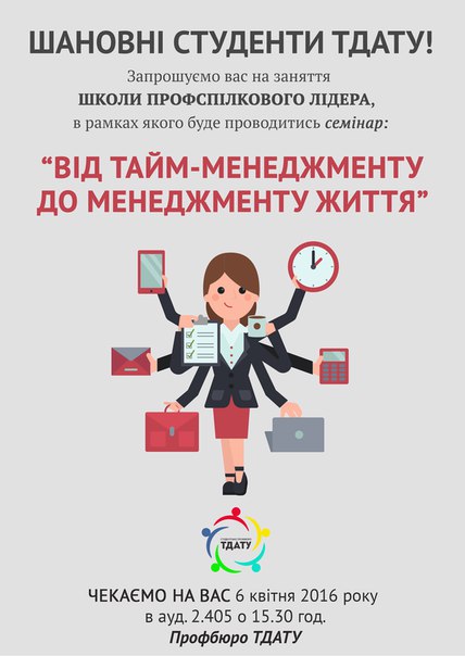 Шановні студенти ТДАТУ! Запрошуємо вас на заняття ШКОЛИ ПРОФСПІЛКОВОГО ЛІДЕРА, в рамках якого буде проводитись СЕМІНАР “ВІД ТАЙМ-МЕНЕДЖМЕНТУ ДО МЕНЕДЖМЕНТУ ЖИТТЯ”.
