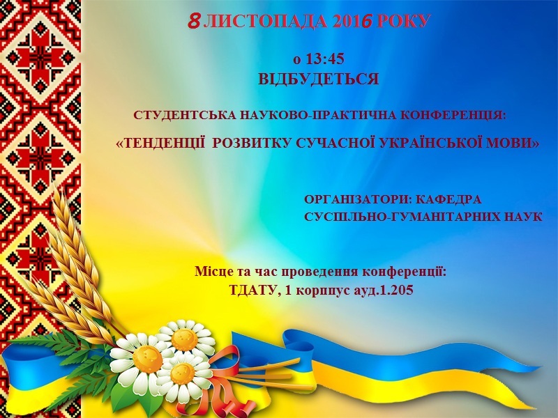 8 листопада 2016 року о 13.45 в ауд. 1.205 відбудеться студентська науково-технічна конференція “Тенденції розвитку сучасної української мови”