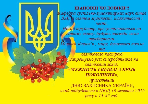 13 жовтня о 13-45 год. у Центрі культури та дозвілля відбудеться святковий захід «МУЖНІСТЬ І ВІДВАГА КРІЗЬ ПОКОЛІННЯ», присвячений ДНЮ ЗАХИСНИКА УКРАЇНИ.