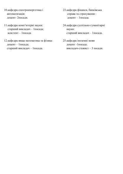 Заяву з додатком особового листка по обліку кадрів, автобіографію, копію трудової книжки завіреною за місцем роботи, копію паспорта, копію реєстраційного номера облікової картки платника податків, фотокартки розміром 3х4см.-4шт., копію диплома про повну вищу освіту та додаток до нього, копії диплома наукового ступеня і атестату про присвоєння вченого звання, копію документів які підтверджують підвищення кваліфікації протягом останніх п’яти років, список наукових праць і охоронних документів на наукові розробки направляти на ім’я ректора за адресою: