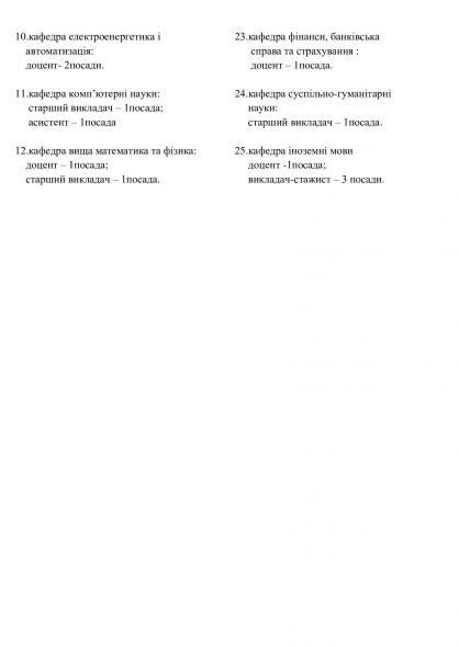 Заяву з додатком особового листка по обліку кадрів, автобіографію, копію трудової книжки завіреною за місцем роботи, копію паспорта, копію реєстраційного номера облікової картки платника податків, фотокартки розміром 3х4см.-4шт., копію диплома про повну вищу освіту та додаток до нього, копії диплома наукового ступеня і атестату про присвоєння вченого звання, копію документів які підтверджують підвищення кваліфікації протягом останніх п’яти років, список наукових праць і охоронних документів на наукові розробки направляти на ім’я ректора за адресою:
