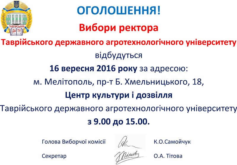 16 вересня 2016 року з 9.00 до 15.00 год. у Центрі культури та дозвілля відбуватимуться вибори ректора Таврійського державного агротехнологічного університету.