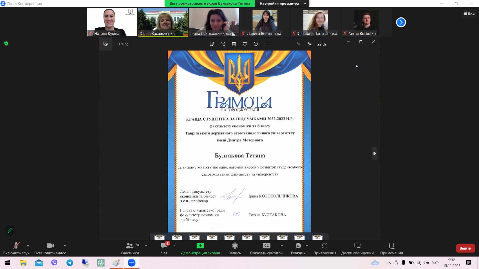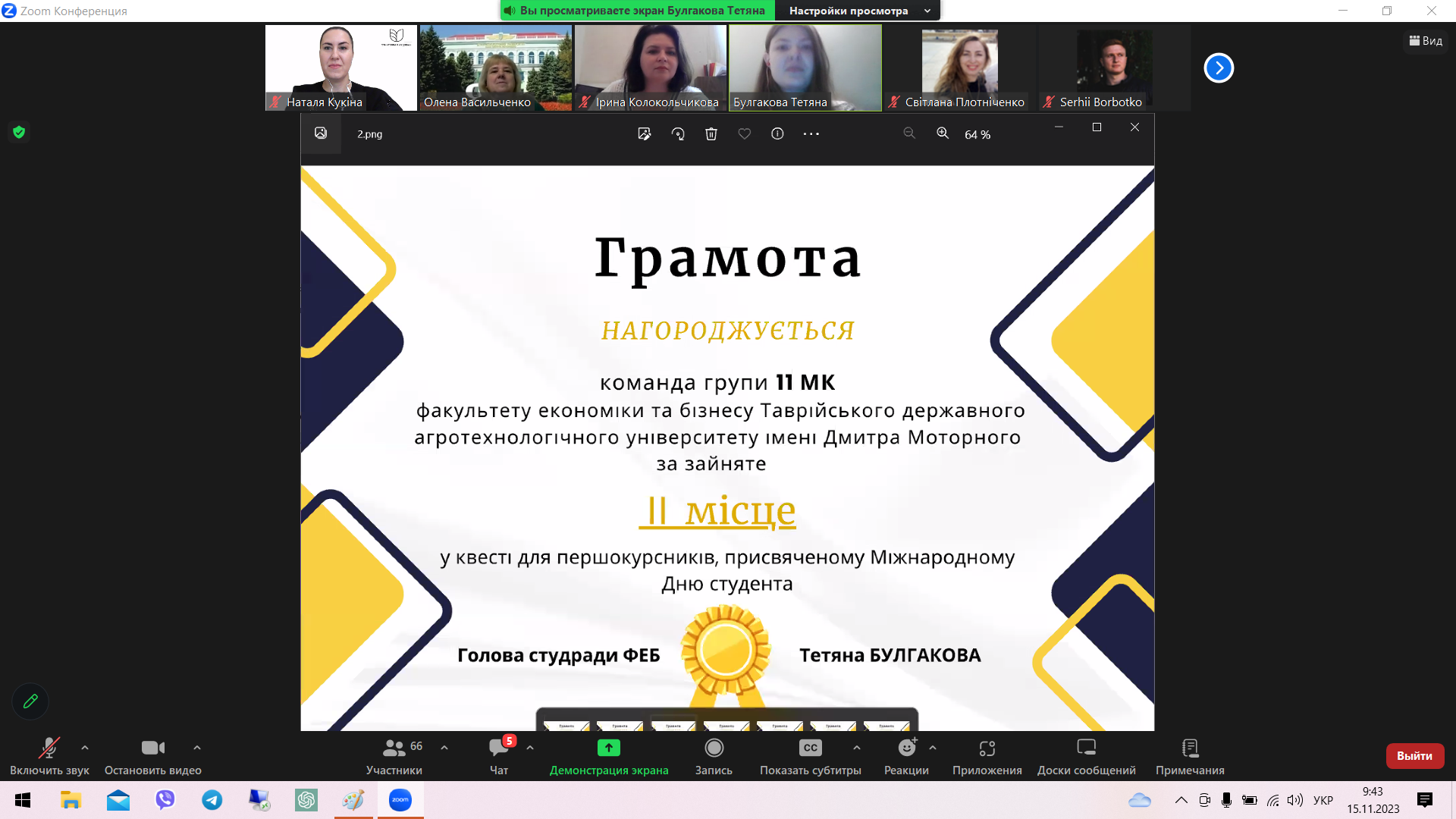 - Булгакова Тетяна (група 11-МБ ЕМ) – краща студентка за підсумками 2022-2023 н.р., голова студентської ради факультету;