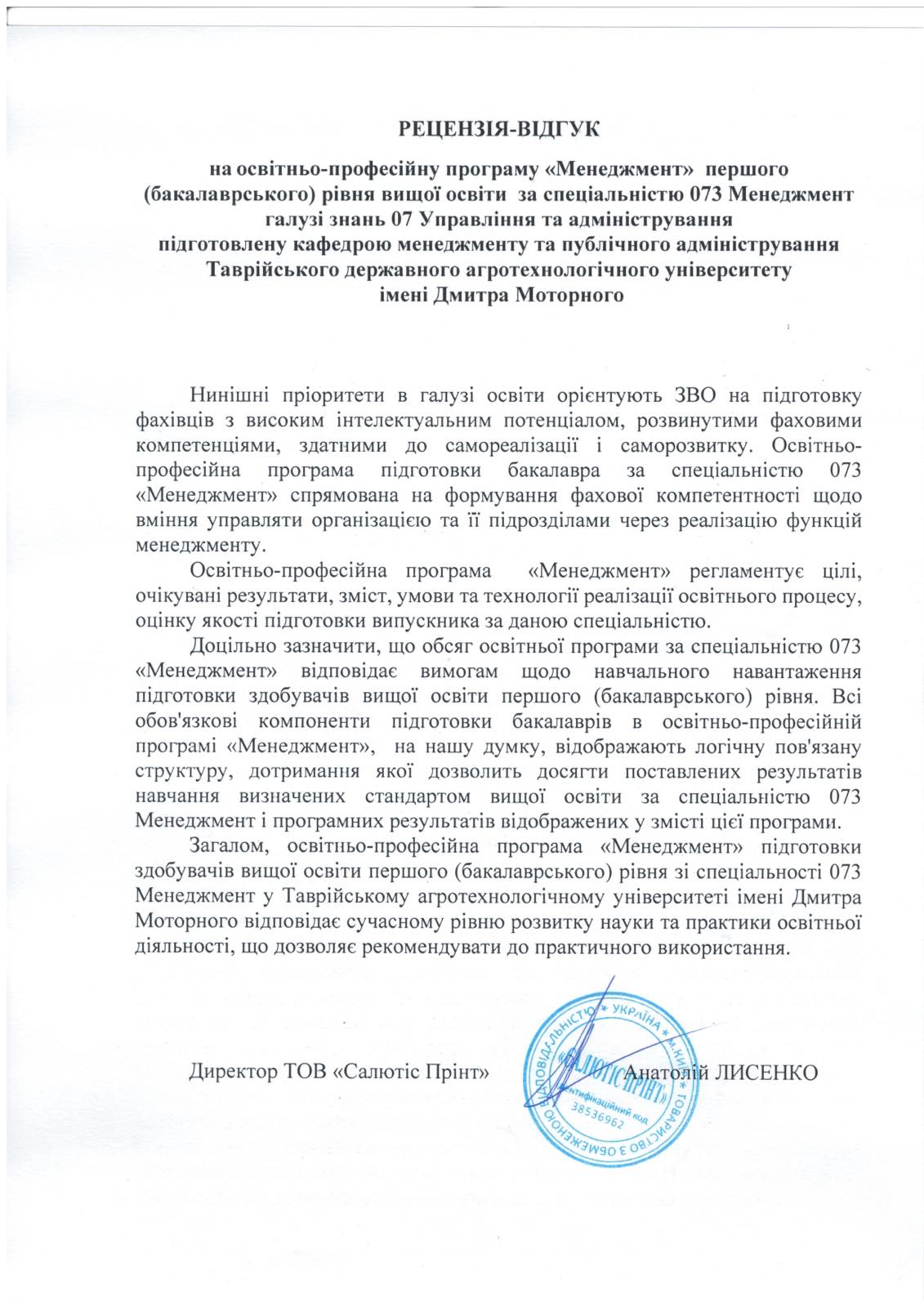 Рецензія-відгук стейкхолдерів на ОПП “Менеджмент” першого (бакалаврського) рівня вищої освіти №1