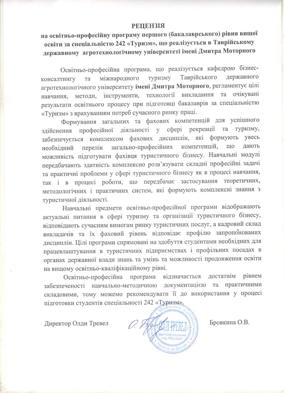 Рецензія-відгук стейкхолдерів на ОПП “ТУРИЗМ” першого (бакалаврського) рівня вищої освіти №3