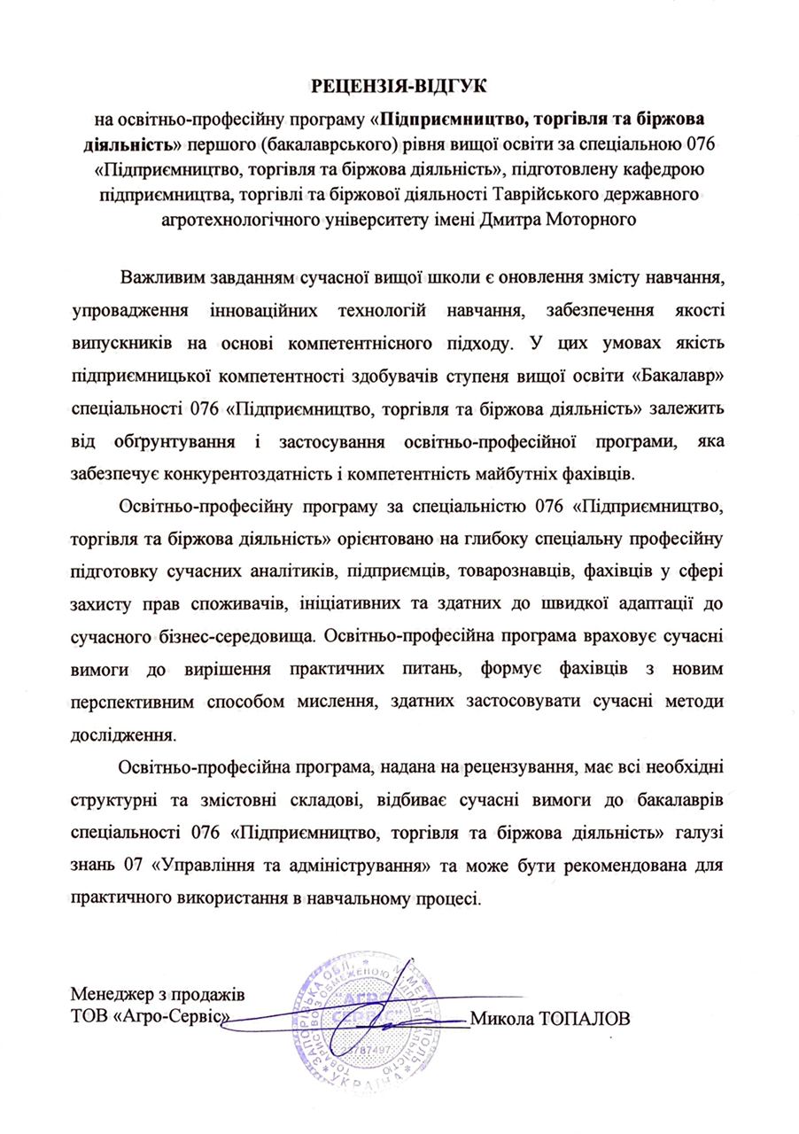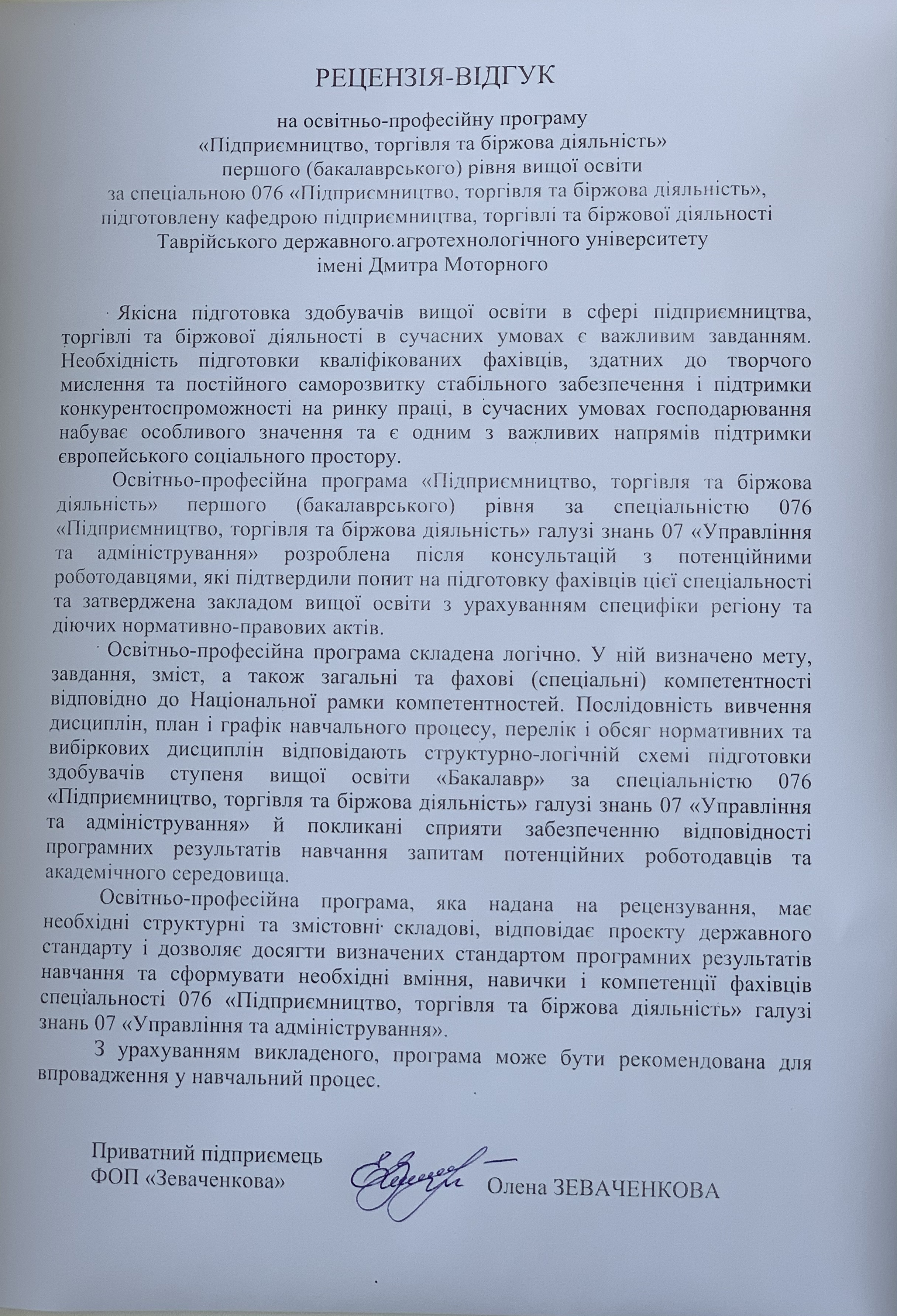 Рецензія-відгук стейкхолдерів на ОПП “ПІДПРИЄМНИЦТВО, ТОРГІВЛЯ ТА БІРЖОВА ДІЯЛЬНІСТЬ” першого (бакалаврського) рівня вищої освіти №7
