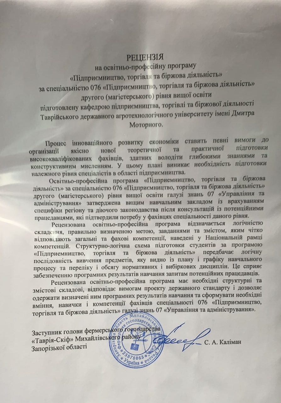 Рецензія-відгук стейкхолдерів на ОПП “ПІДПРИЄМНИЦТВО, ТОРГІВЛЯ ТА БІРЖОВА ДІЯЛЬНІСТЬ” першого (бакалаврського) рівня вищої освіти №5