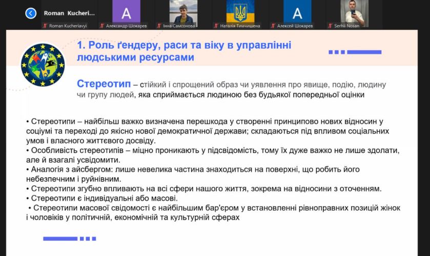 Програма тренінгу охоплювала сучасну тематику, а саме: роль гендеру, раси та віку в управлінні людськими ресурсами; толерантність та культурне різноманіття в Європі: перспективи та поточний стан; європейський досвід боротьби з дискримінацією в сфері зайнятості, Конфлікти та протиріччя в управлінні організаціями.