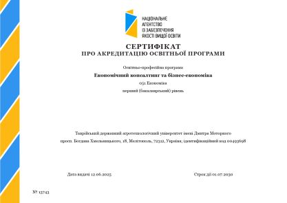 У 2024 – 2025 навчальному році кафедрі економіки і бізнесу ТДАТУ було поставлене завдання щодо підготовки до повної акредитації двох освітньо – професійних програм «Економічний консалтинг та бізнес – економіка» та «Туризм».