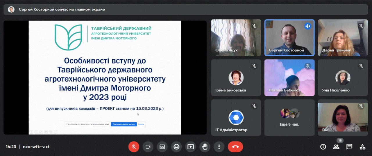 За період з 3.03.2023 року по 22.03.2023 року на платформі ZOOM та Google Classroom було організовано та проведено зустрічі з керівництвом, викладачами та здобувачами освіти Ногайського, Оріхівського, Мелітопольського, Василівського, Бердянського, Новокаховського фахових коледжів ТДАТУ. З випускниками Оріхівського фахового коледжу була можливість зустрітись офлайн.