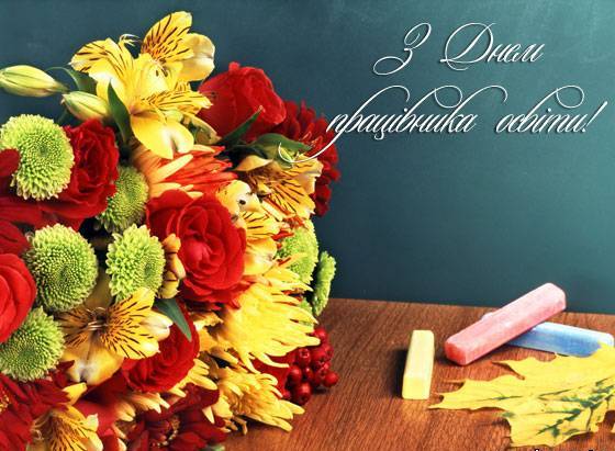 З Днем працівників освіти ! Нехай промені здоров’я й сили, злагоди й спокою, наснаги й бадьорості, творчості й удачі, щастя земного супроводжують Вас. Нехай зима, що дарує новий відлік року, сріблом замете всі Ваші негаразди, весна принесе хліба й сонця, осінь – книгу й працю, а літо – здоров’я й радість. Хай Ваше щире серце буде як завжди відкритим і чесним, Ваші думки мудрими й добрими, Ваші дії щедрими й успішними.