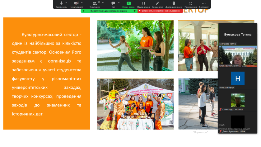 Далі, голова студентської ради факультету Тетяна Булгакова виступила з презентацією, що пояснює структуру та основну мету студентської ради, сенс її існування та основні напрямки діяльності. Були представленні сектори та короткий зміст їх основної роботи для повноцінного і чіткого функціонування студентської ради.