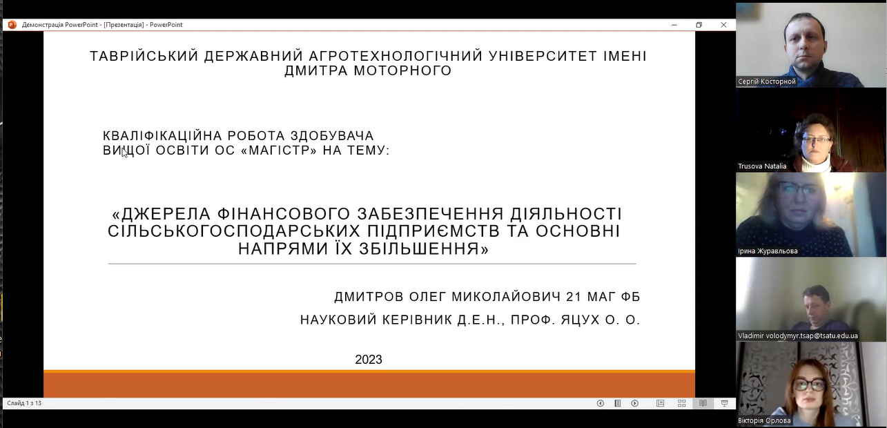Члени комісії особливо відмітили високий рівень магістерської роботи здобувача Олега Дмитрова на тему «Джерела фінансового забезпечення діяльності сільськогосподарських підприємств та основні напрями їх збільшення» (науковий керівник д.е.н., професор Олена Яцух) та надали йому рекомендацію до вступу в аспірантуру.