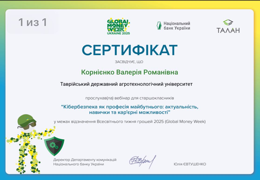 Теми, розглянуті під час вебінарів, включали: інформаційну гігієну в цифровому середовищі; розпізнавання фейкових фінансових порад та шахрайських схем; роль цифрових компетентностей у забезпеченні особистої фінансової безпеки; використання ШІ як інструменту перевірки надійності джерел фінансової інформації. За активну участь у заходах Global Money Week 2025 здобувачі кафедри отримали серію сертифікатів від Центру фінансових знань «Талан», що засвідчують її успішне опрацювання актуальних тем з фінансової грамотності. Отримані сертифікати є не лише свідченням особистої активності, а й підтвердженням високого рівня залученості кафедри до актуальних міжнародних освітніх ініціатив, що сприяють формуванню фінансової культури, цифрової обізнаності та відповідального ставлення до управління особистими фінансами.