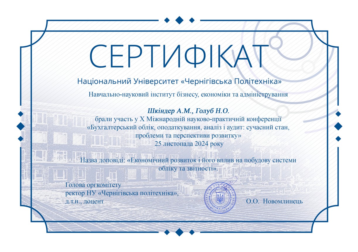 25 листопада 2024 року на базі Національного університету “Чернігівська політехніка” відбулась Х Міжнародна науково-практична конференція “Бухгалтерський облік, оподаткування, аналіз і аудит: сучасний стан, проблеми та перспективи розвитку”. В ній взяла участь здобувачка групи 21 ФФ Анастасія Шкіндер з науковим керівником, представивши доповідь на тему “Економічний розвиток і його вплив на побудову системи обліку і звітності”.