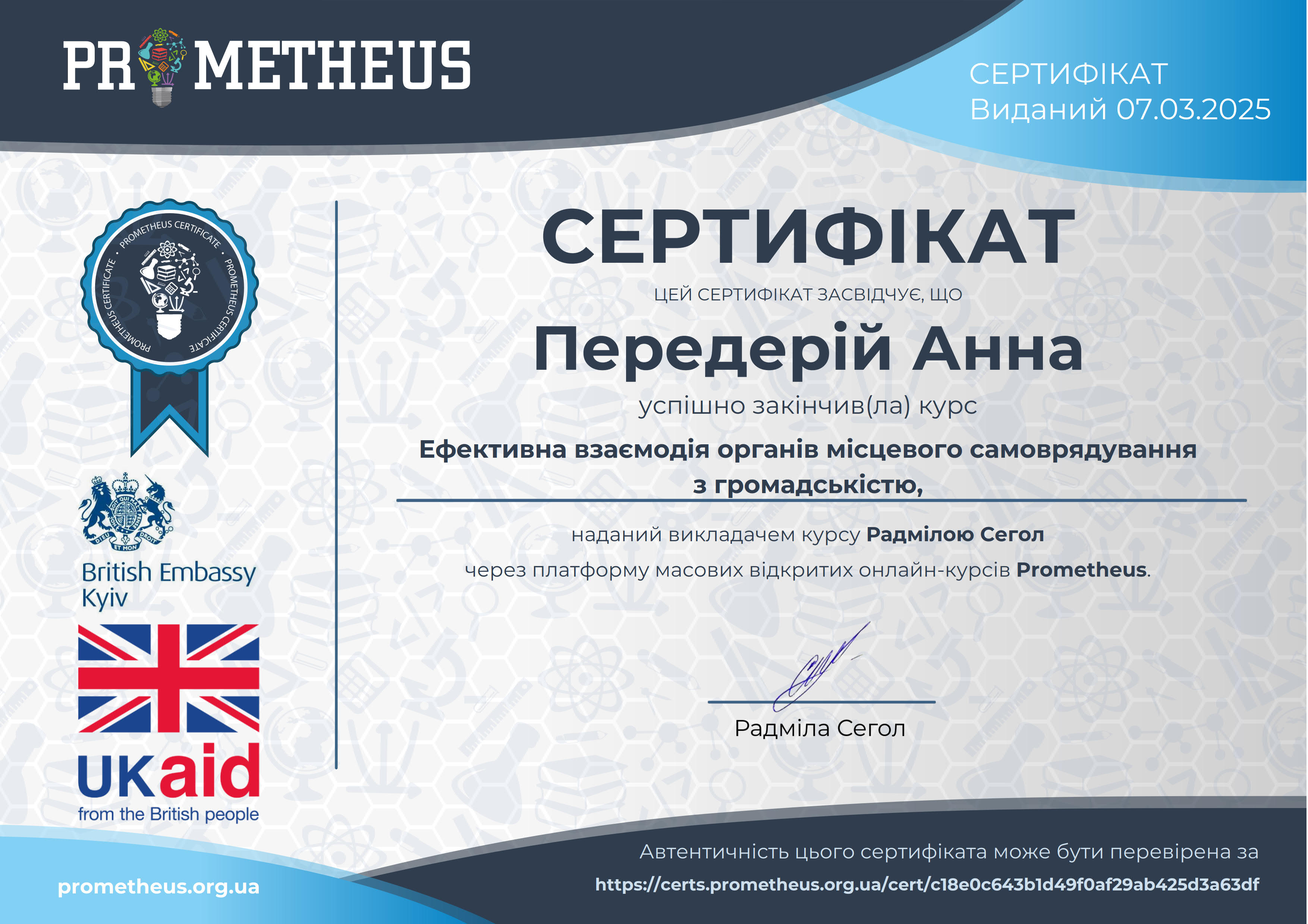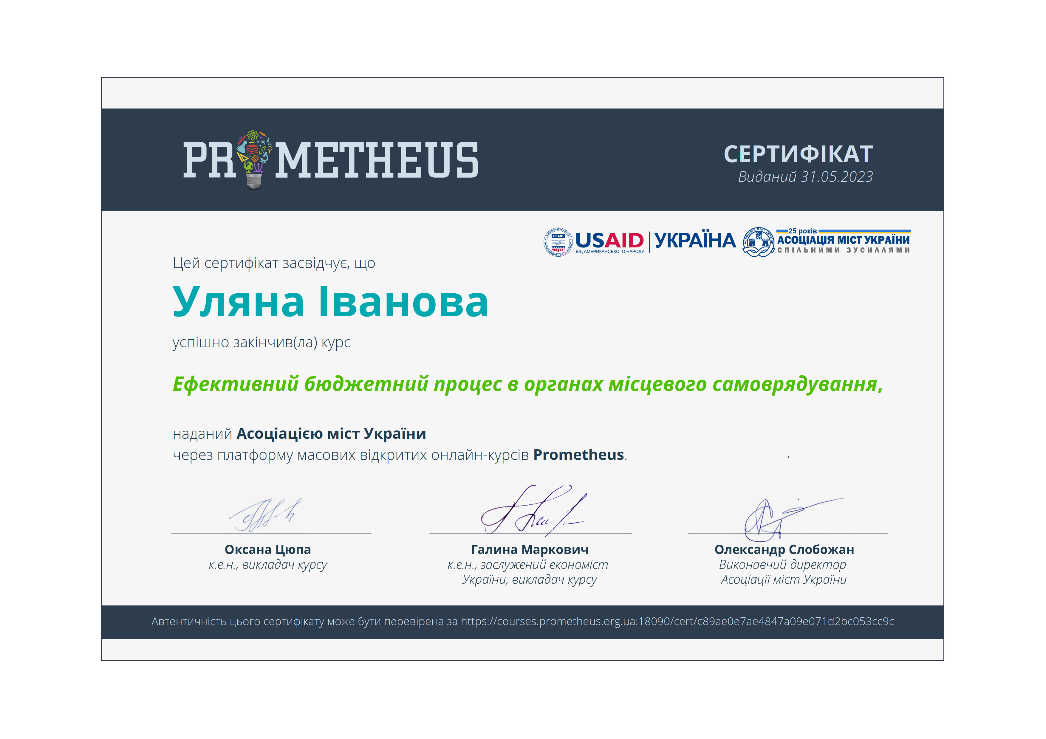 В рамках навчальної практики “Фінанси бюджетних установ” студенти 3 курсу закріпили свої знання та навички, пройшовши онлайн-курси «Ефективний бюджетний процес в органах місцевого самоврядування», “Ефективна взаємодія органів місцевого самоврядування з громадськістю”, “Складання прогнозу місцевого бюджету: теорія і практичні аспекти” на платформі Prometeus, та отримали сертифікати.