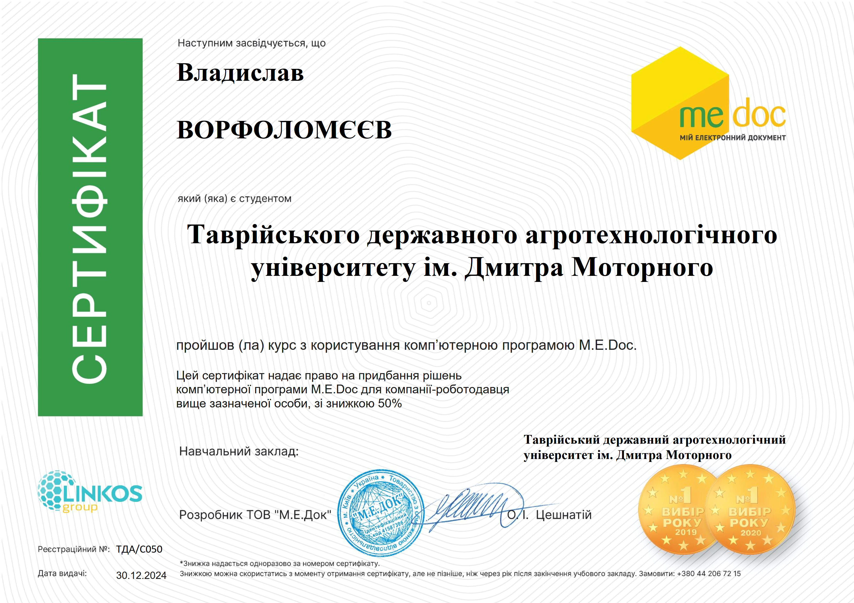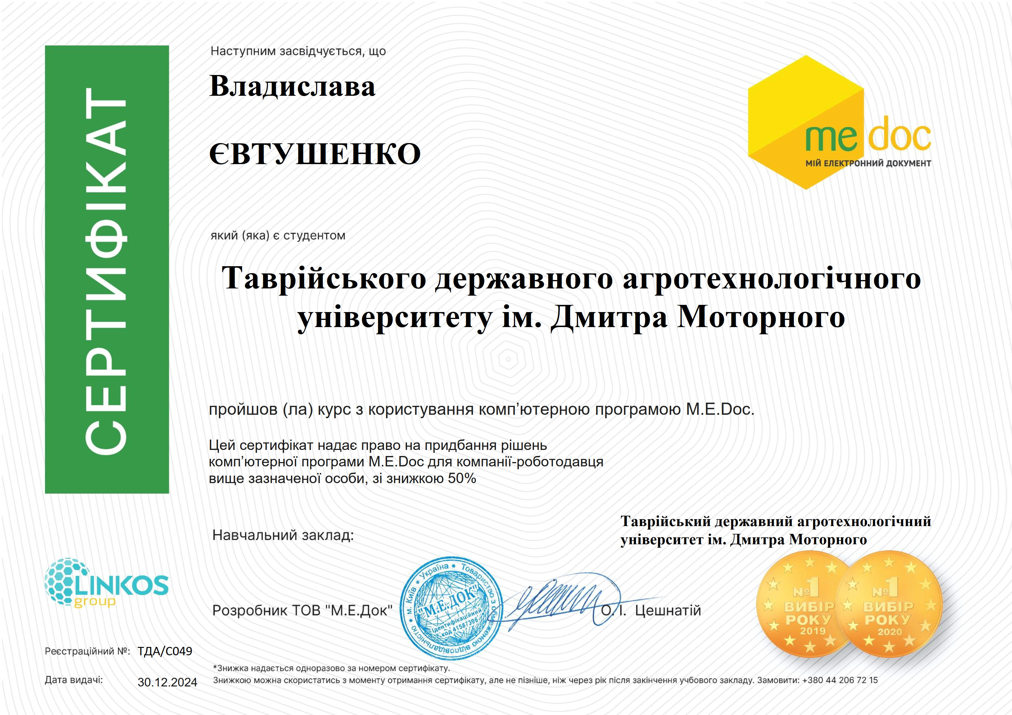 В рамках реалізації програми неформальної освіти з обов’язкової освітньої компоненти «Інформаційні системи і технології у фінансах» здобувачі вищої освіти Таврійського державного агротехнологічного університету імені Дмитра Моторного, спеціальності 072 «Фінанси, банківська справа, страхування та фондовий ринок», освітньої програми «Фінанси, банківська справа та страхування» під керівництвом доцента кафедри фінансів, обліку і оподаткування Олександра Юрченка та доцента кафедри фінансів, обліку і оподаткування Володимира Цапа пройшли навчання з освоєння програмного забезпечення «M.E.Doc» в рамках вивчення теми 5 Організація системи електронного документообігу відповідно до робочої програми освітньої компоненти.