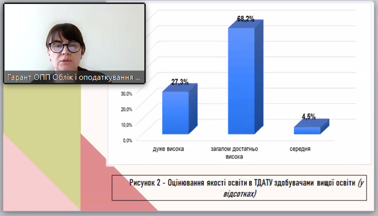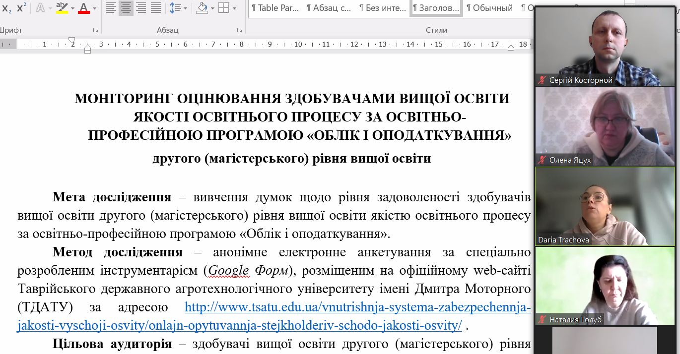 19 лютого 2024 року на кафедрі фінансів, обліку і оподаткування ТДАТУ відбулося обговорення результатів опитувань, проведених в І семестрі 2023-2024 н.р. серед викладачів, роботодавців та студентів бакалаврського і магістерського рівнів освітніх програм «Облік і оподаткування».
