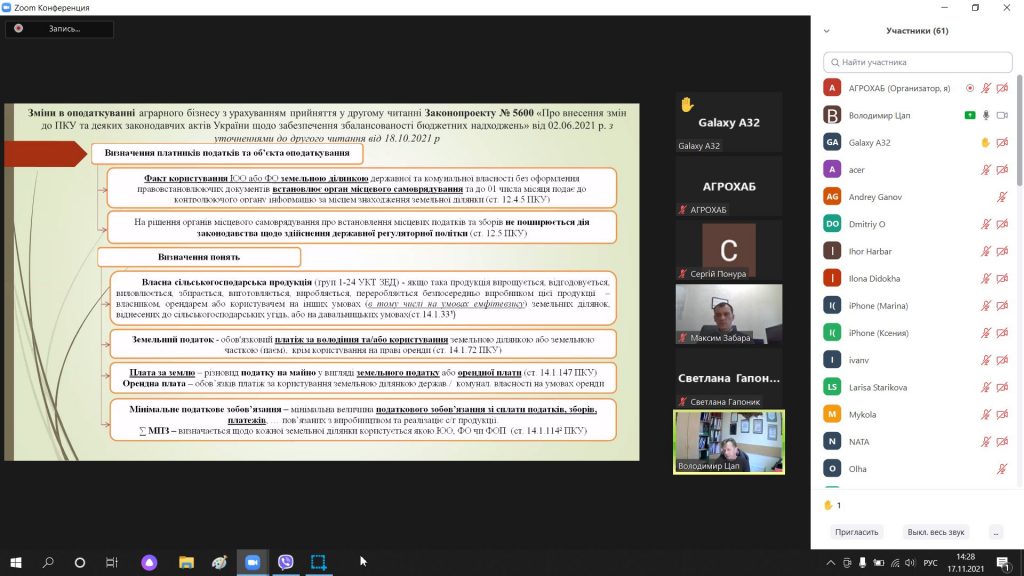 17 листопада 2021 року пройшов онлайн-тренінг “Оптимізація оподаткування діяльності сільськогосподарських товаровиробників. Зміни в оподаткуванні аграрного бізнесу з урахуванням законопроекту № 5600 від 02.06.2021”.