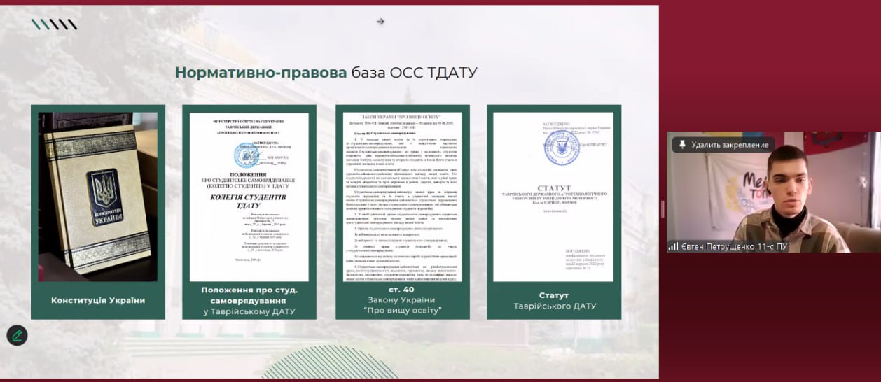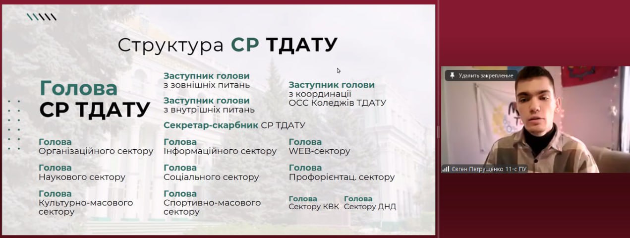 30 січня 2025 року студенти кафедри фінансів, обліку та оподаткування ТДАТУ взяли участь у онлайн-зустрічі «Студентський діалог». Це частина серії заходів, спрямованих на розвиток студентського самоврядування та активну участь студентів у формуванні майбутнього університету.