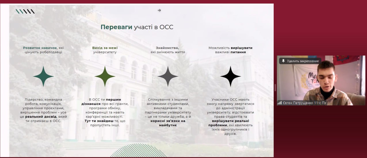 Зустріч була орієнтована на студентів, які мали змогу дізнатися більше про структуру, завдання та можливості органів студентського самоврядування, а також поділитися своїми думками та запитаннями, що стосуються студентського життя.