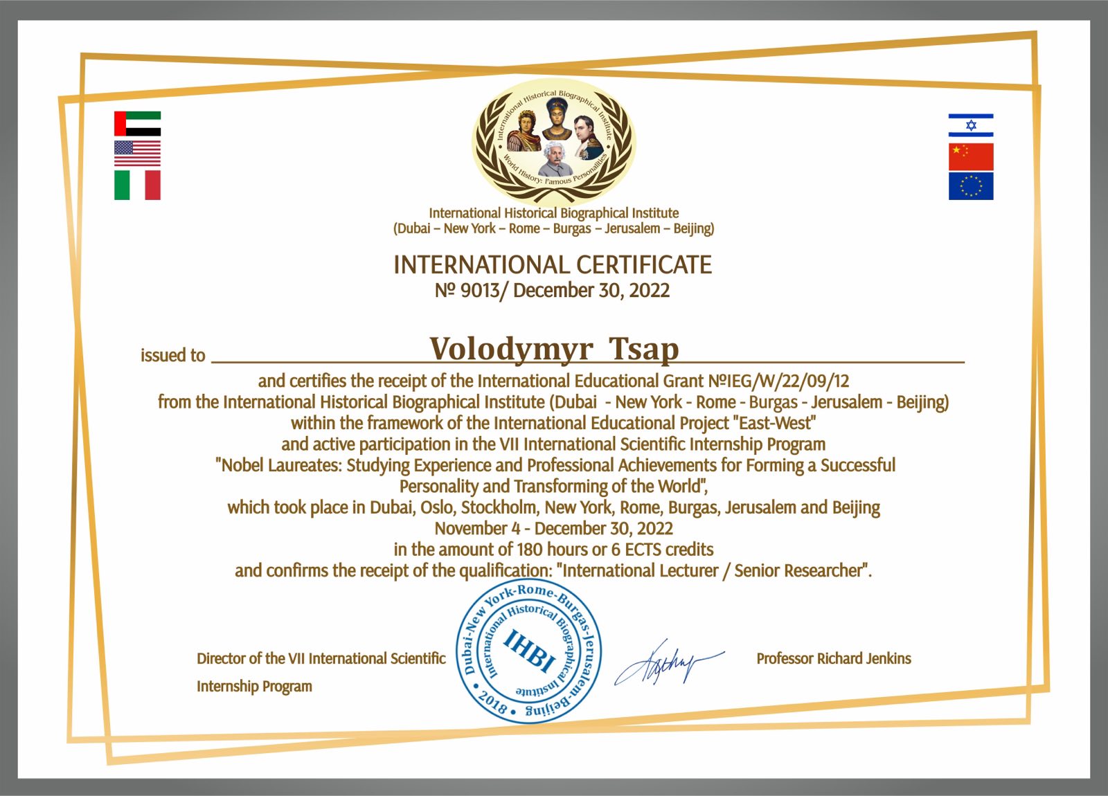 - International Historical Biographical Institute (Dubai - New York – Rome – Burgas - Jerusalem - Beijing), сертифікат № 9013 від 30.12.2022 р.