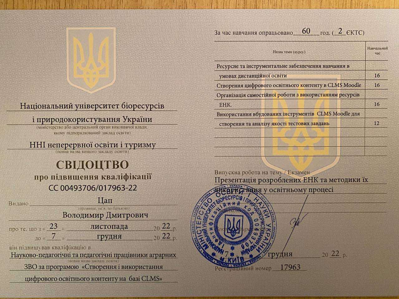 - Національний університет біоресурсів і природокористування України. Свідоцтво СС 00493706/017963-22 від 07.12.2022 р.