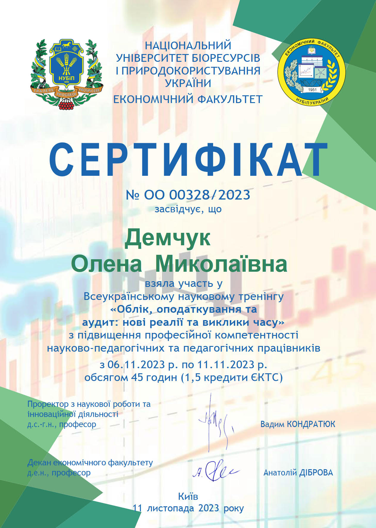 - Всеукраїнський науковий тренінг «Облік, оподаткування та аудит: нові реалії та виклики часу», НУБІП, 6-11.11.2023 р.