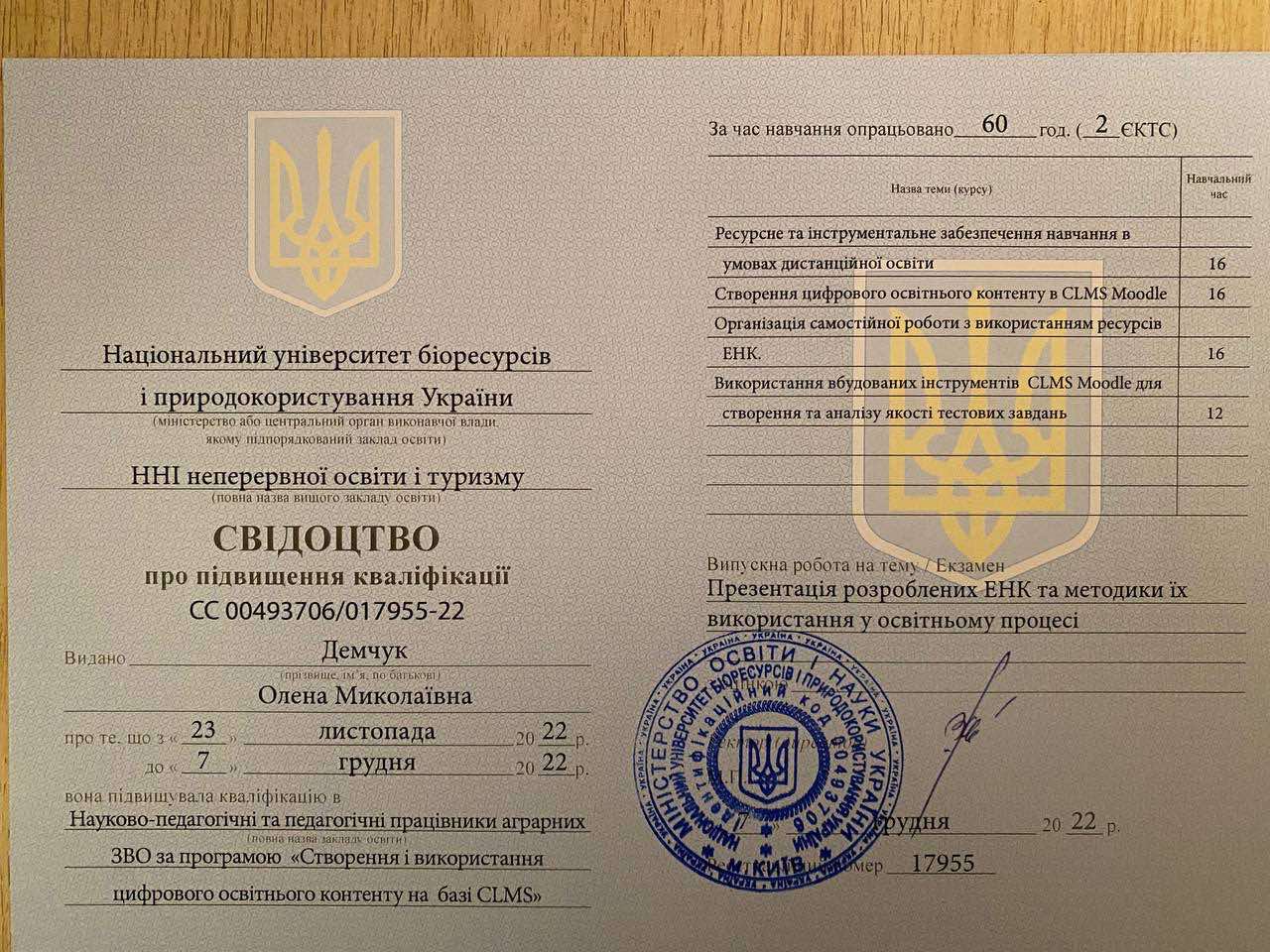 - Національний університет біоресурсів і природокористування України. Свідоцтво СС 00493706/017955-22 від 07.12.2022 р.