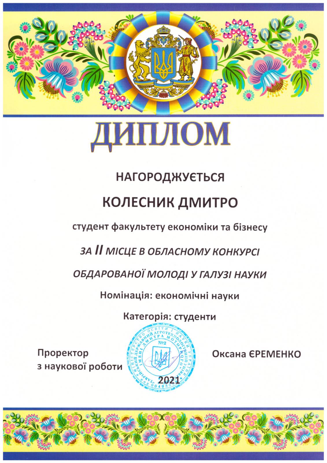 Результатом роботи наукових гуртків кафедри є підготовка наукових робіт до участі в конкурсах. Вітаємо здобувача освітнього рівня “Магістр” спеціальності “Фінанси, банківська справа та страхування” Дмитра Колесника із здобуттям призового місця на обласному конкурсі наукових робіт Запорізької ОДА та нагородженням дипломом II ступеня за дослідження «Формування експортного потенціалу та перспективи розвитку торговельного співробітництва України з ЄС». Керівник наукової роботи – к.е.н., доцент, в.о. завідувача кафедри фінансів, обліку і оподаткування Іван Демченко.