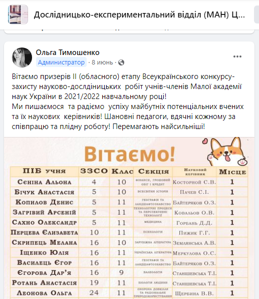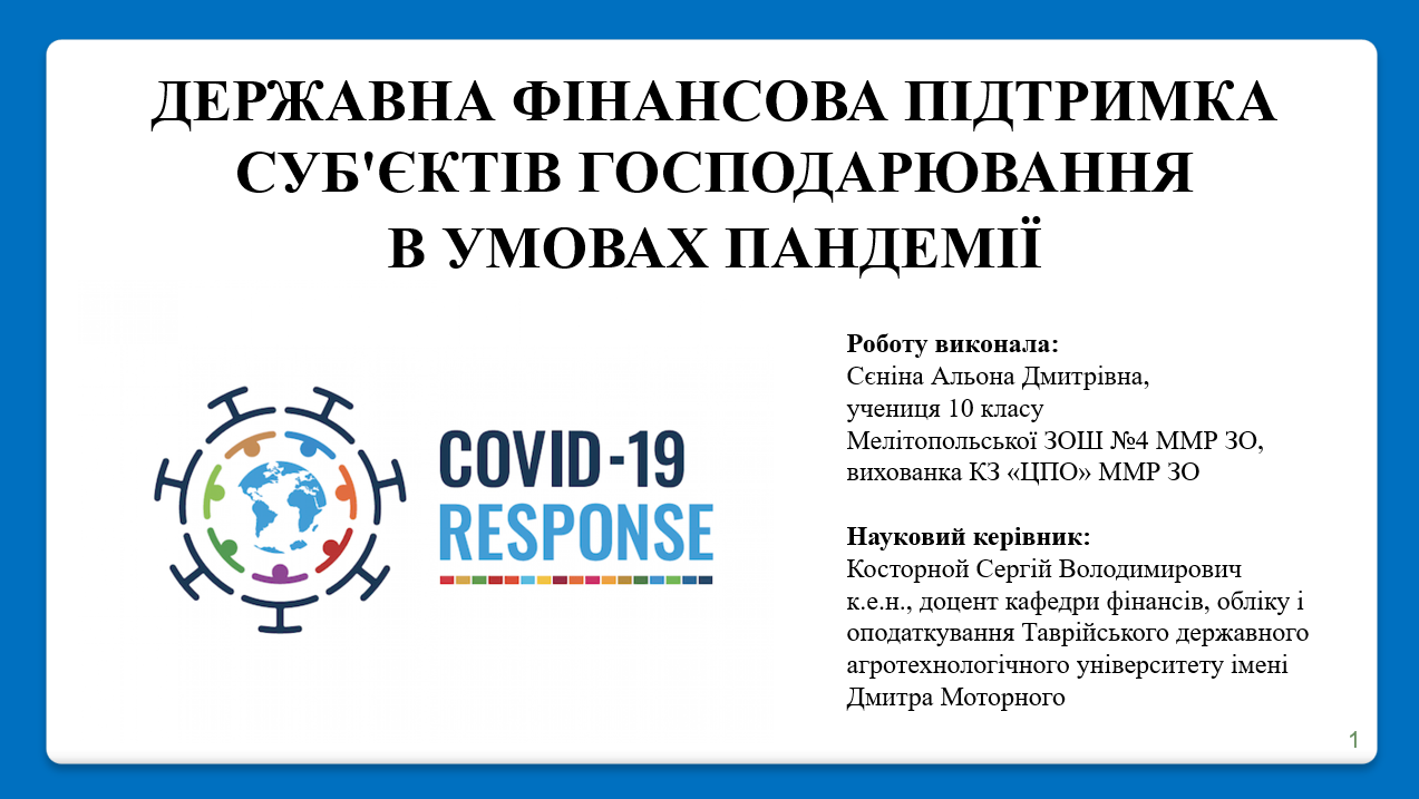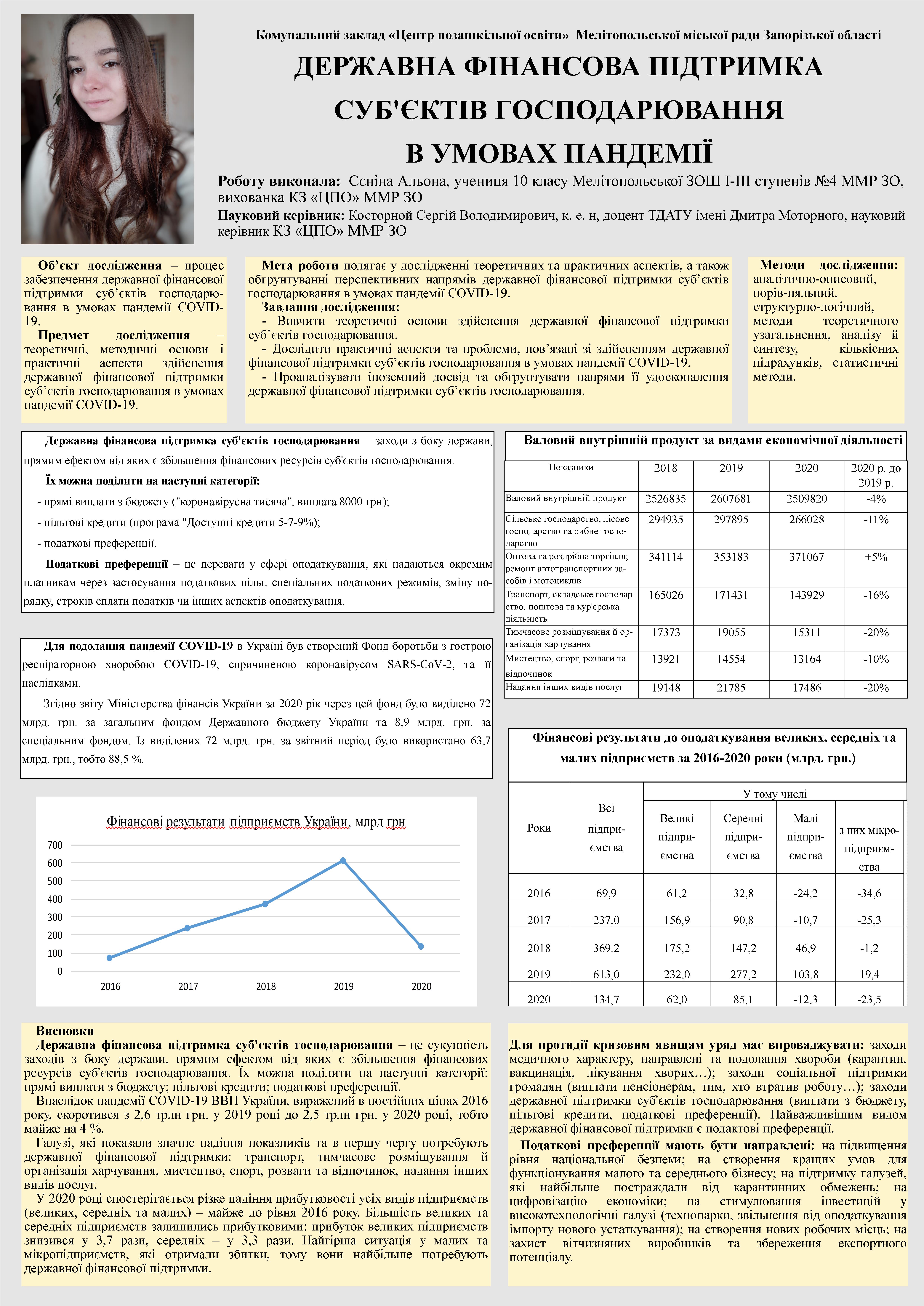 Сєніна Альона, учениця 10 класу Мелітопольської ЗОШ №4, зайняла І місце на обласному етапі Всеукраїнського конкурсу-захисту наукових робіт Малої академії наук в секції “Фінанси, грошовий обіг і кредит” з науковою роботою “Державна фінансова підтримка суб’єктів господарювання в умовах пандемії” (науковий керівник – к.е.н, доцент кафедри фінансів, обліку і оподаткування Сергій Косторной).