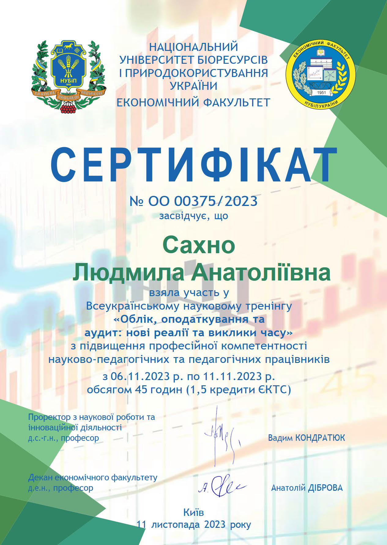 Активну участь викладачі кафедри беруть у вебінарах і практикумах, які проводить ТОВ “М.Е.Док”. Більшість викладачів є членами Федерації аудиторів, бухгалтерів і фінансистів АПК України.