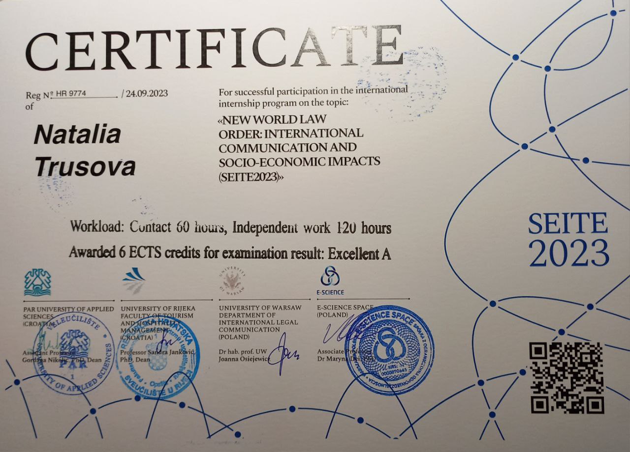 За останні роки викладачі кафедри проходили міжнародне стажування і підвищення кваліфікації в таких зарубіжних вищих навчальних закладах, як Варшавський університет (Інститут економіки і фінансів); Chornorizets Hrabra Varna Free University, Болгарія; Mykolas Romeris University, Латвія; International Historical Biographical Institute (Dubai – New York – Rome – Burgas – Jerusalem – Beijing); Estonian Business School; The European Institute for Innovation Development (Ostrava, Czech Republic, EU); European Academy of Sciences and Research (Germany, Hamburg).