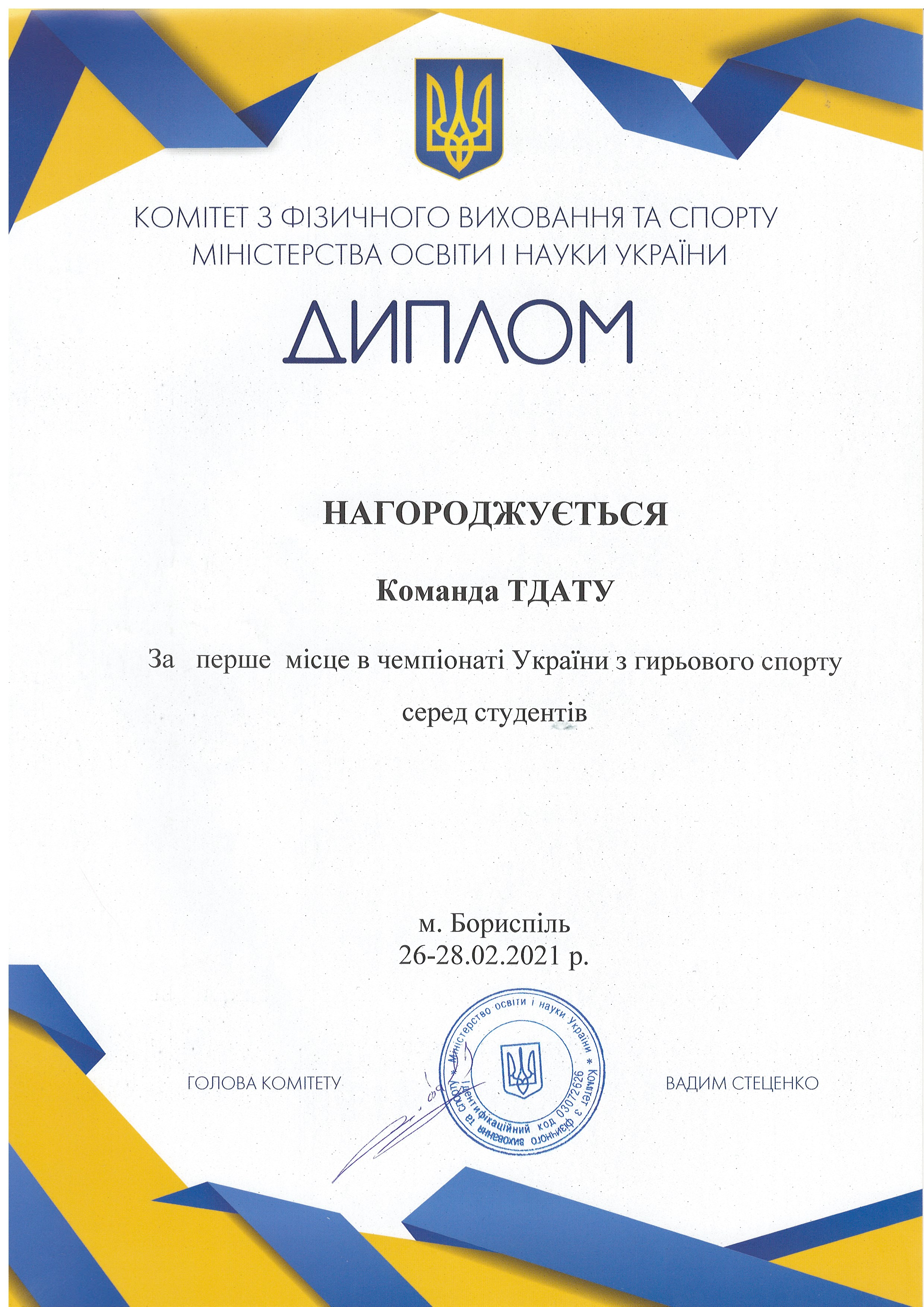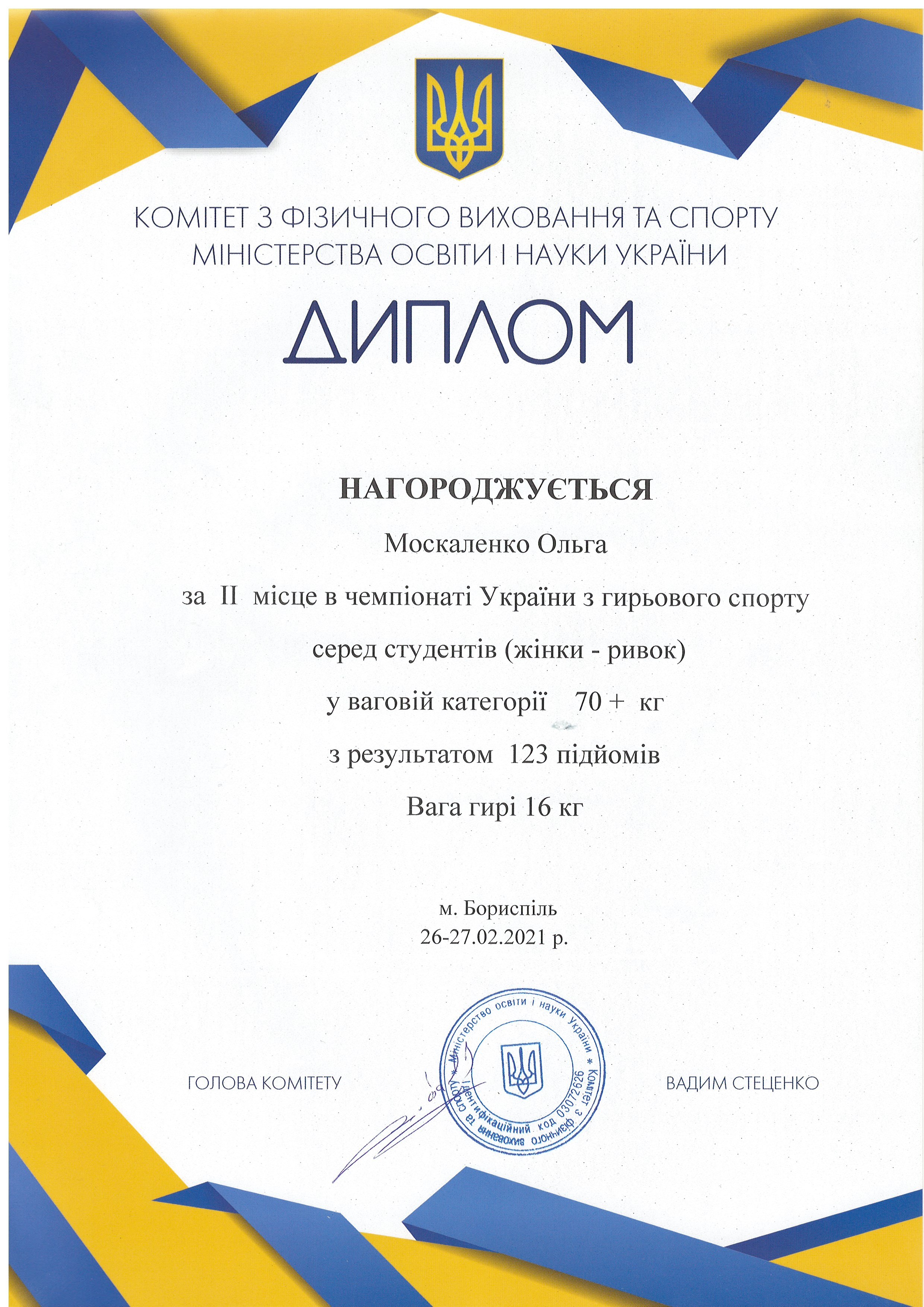 2. Чемпіонат України серед дорослих та юніорів з гирьового спорту (м. Київ, 25-28.03.2021 р.): Семененко Володимир – 22 АІ (II місце у ваговій категорії до 68 кг серед юніорів у двоєборстві; III місце у ваговій категорії до 68 кг серед юніорів за довгим циклом); Москаленко Ольга – 41 ХТ (IV місце у ваговій категорії 68+ кг серед юніорок у ривку 24-кг гирі протягом 12 хвилин) – ГРАМОТА 1, ГРАМОТА 2