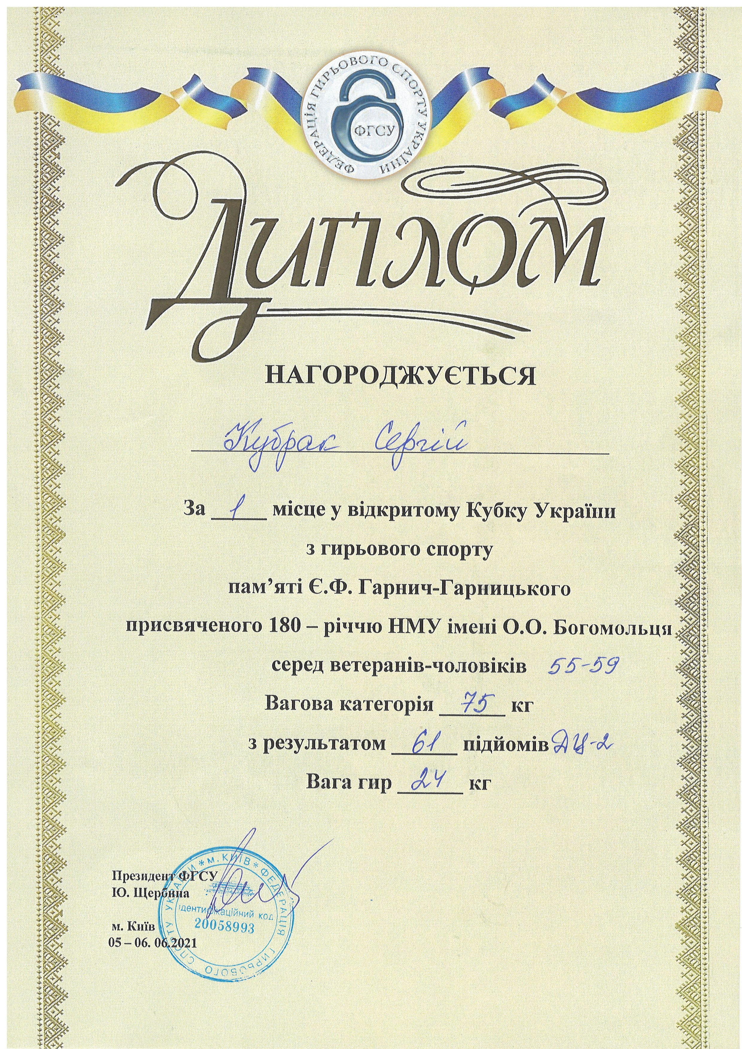 4. Відкритий Кубок України з гирьового спорту пам’яті Є.Ф. Гарнич-Гарницького, присвяченого 180-річчю Національного медичного університету імені О.О. Богомольця, серед ветеранів-чоловіків (м. Київ, 5-6.06.2021 р.): Кубрак Сергій Іванович, старший викладач кафедри фізичного виховання і спорту (І місце серед ветеранів 55-59 років, вагова категорія до 75 кг у поштовху за довгим циклом) – ГРАМОТА