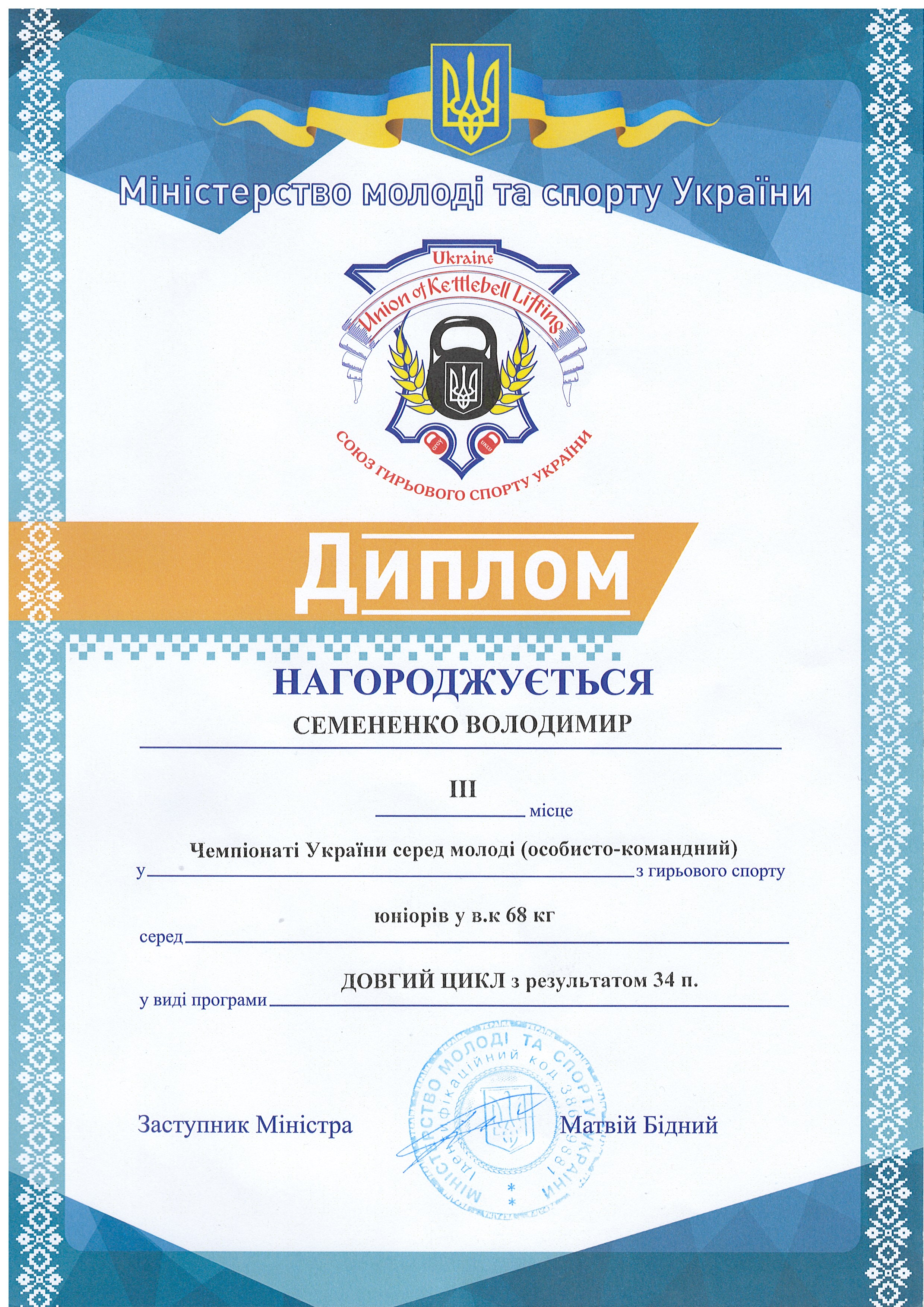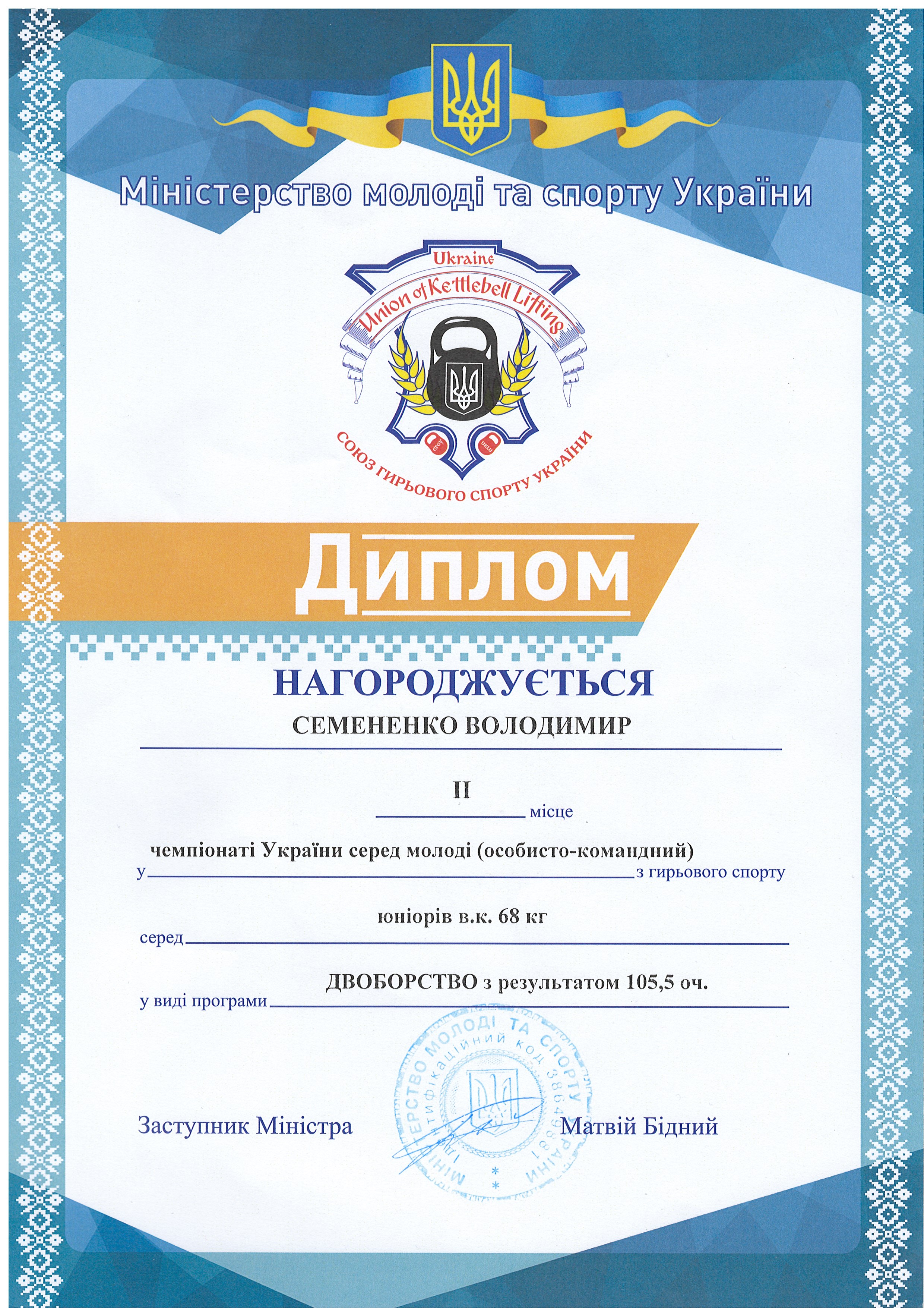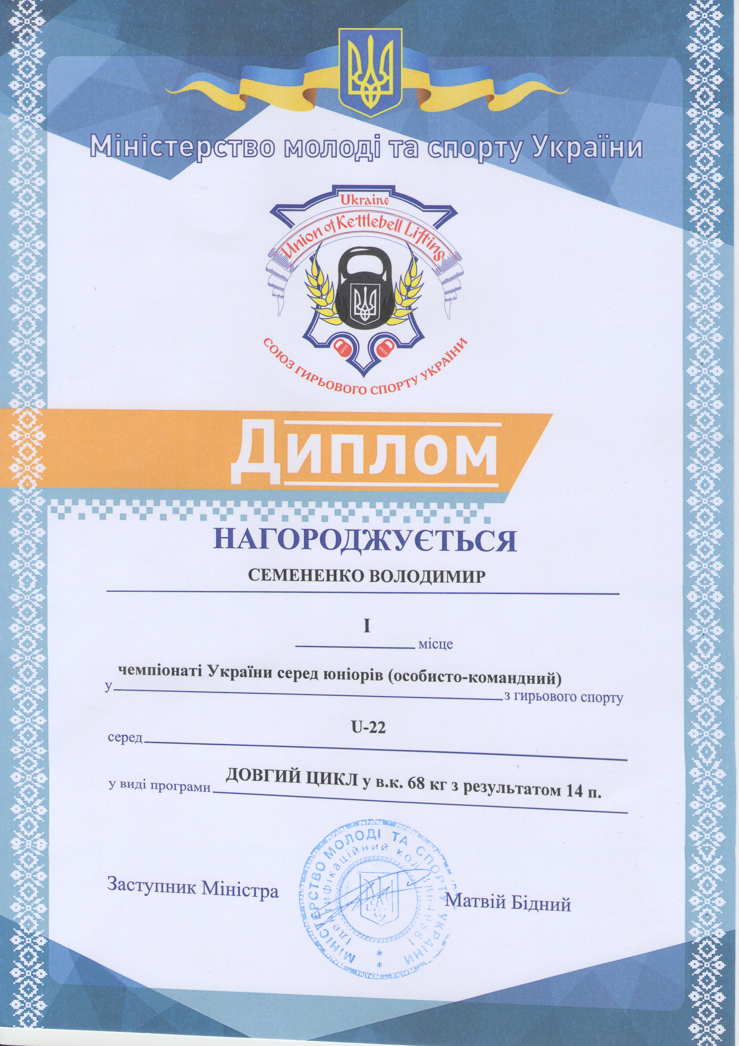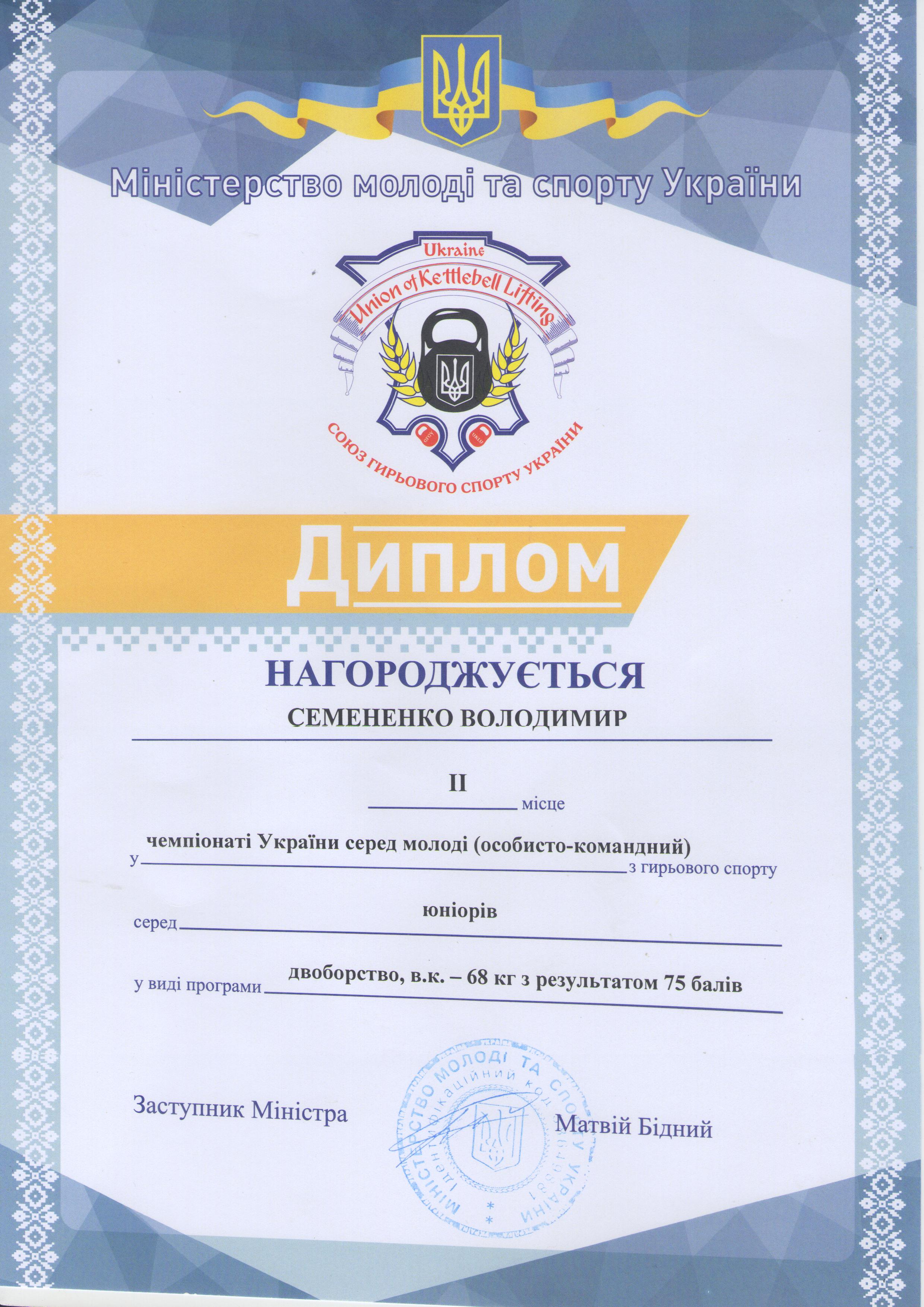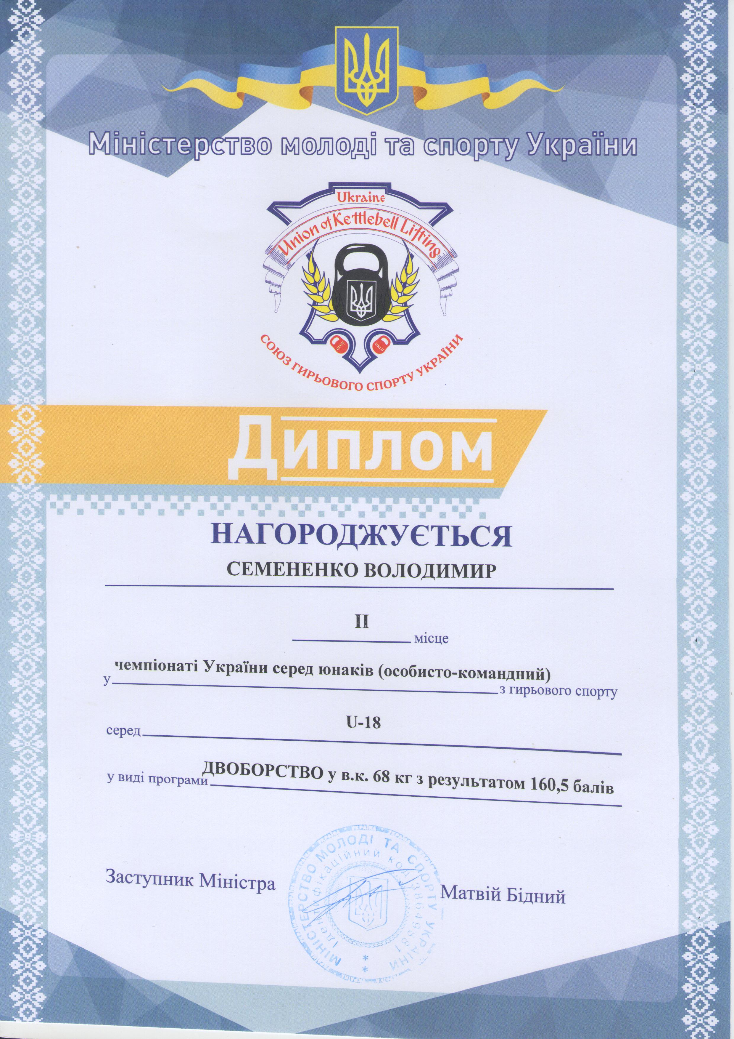 1. Чемпіонат України з гирьового спорту серед юнаків, дівчат, юніорів, чоловіків, жінок та ветеранів (м. Київ, 23-27.09.2020 р.): Семененко Володимир – 22 АІ (І місце у ваговій категорії до 68 кг серед юніорів за довгим циклом; II місце у ваговій категорії до 68 кг серед юнаків у двоборстві (поштовх + ривок); II місце у ваговій категорії до 68 кг серед юніорів у двоборстві (поштовх + ривок) – ГРАМОТА 1, ГРАМОТА 2, ГРАМОТА 3