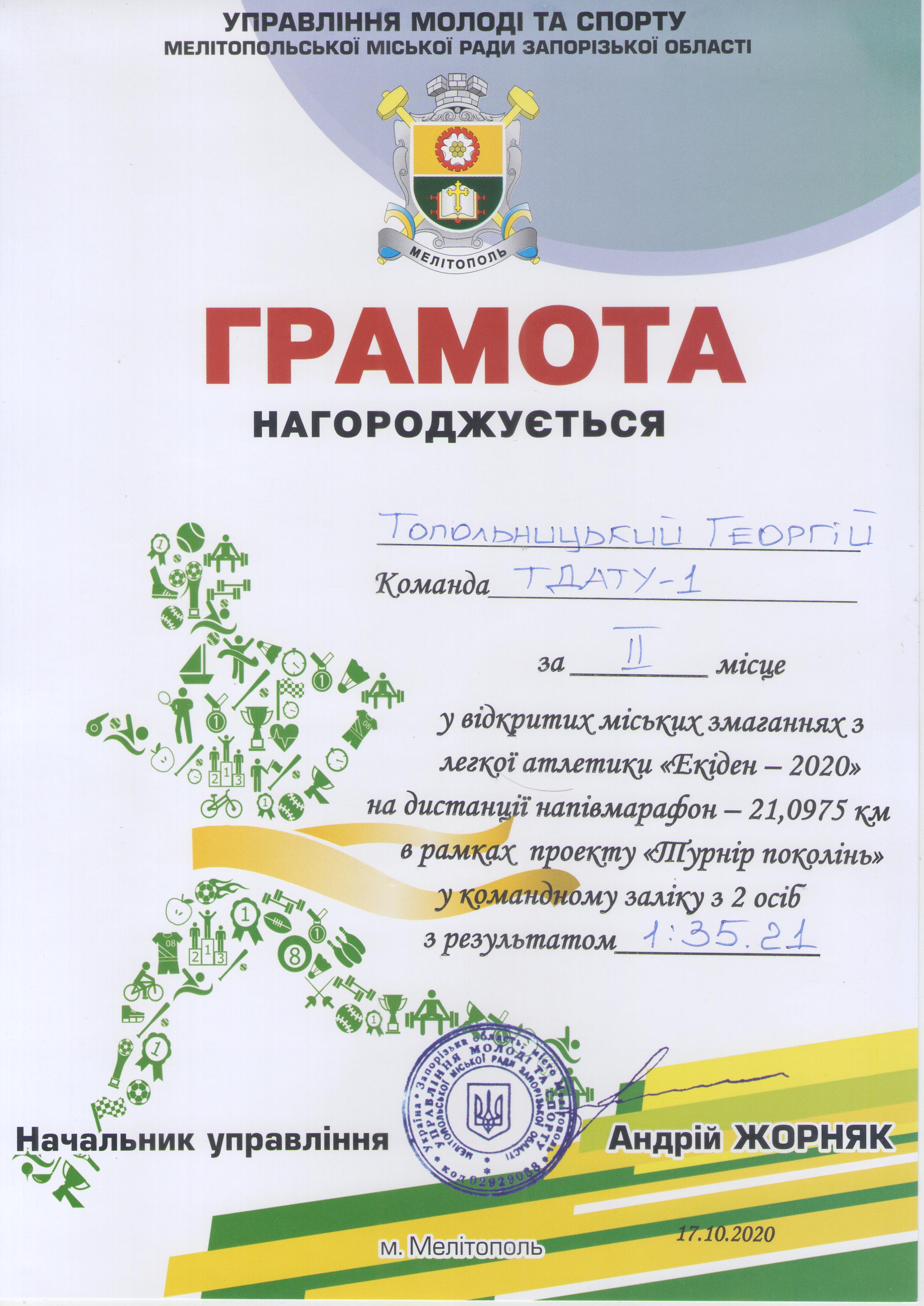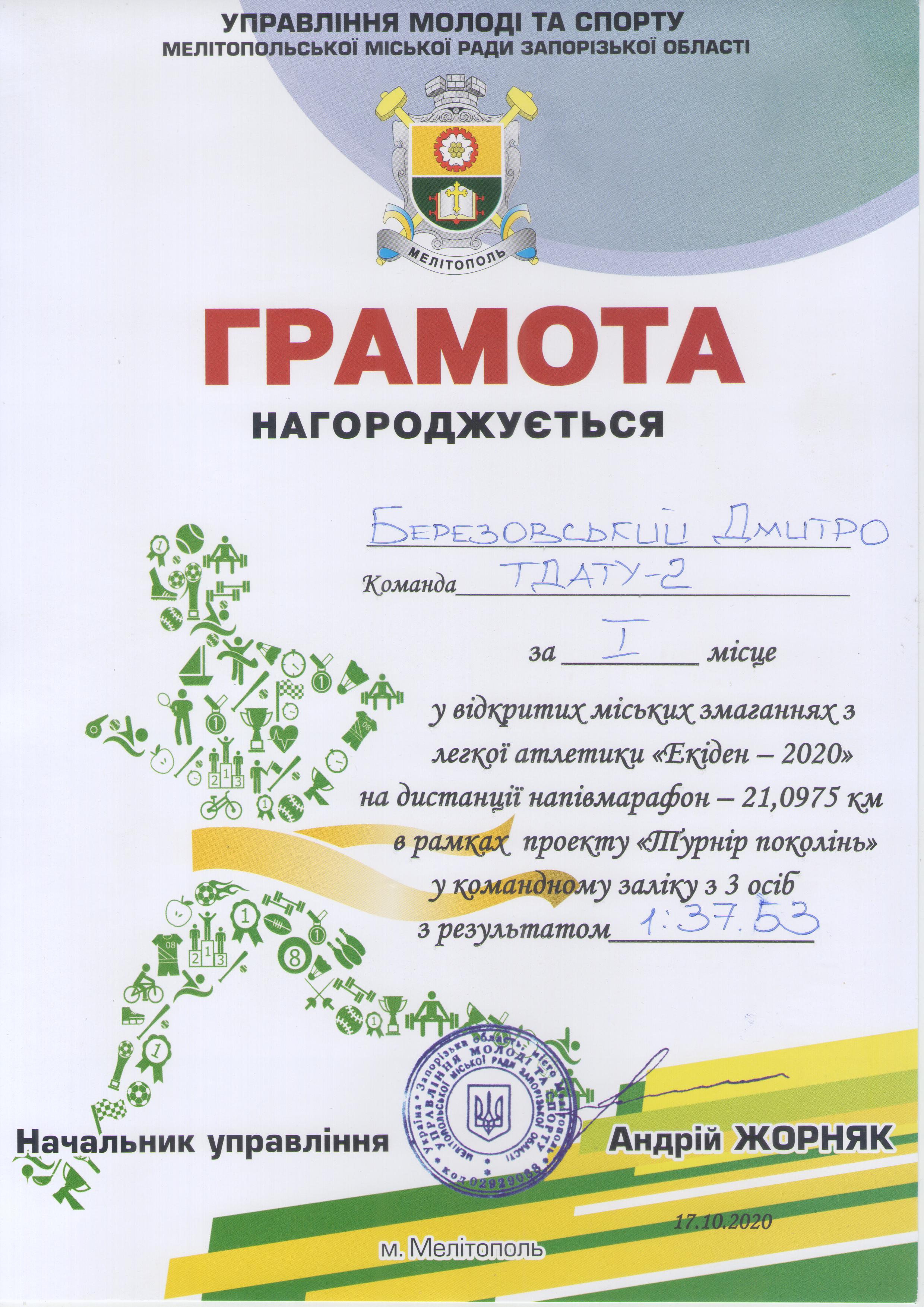 2. Відкриті міські змагання з легкої атлетики “Екіден-2020” на дистанції напівмарафон – 21,0975 км в рамках проєкту “Турнір поколінь” (м. Мелітополь, 17.10.2020 р.):