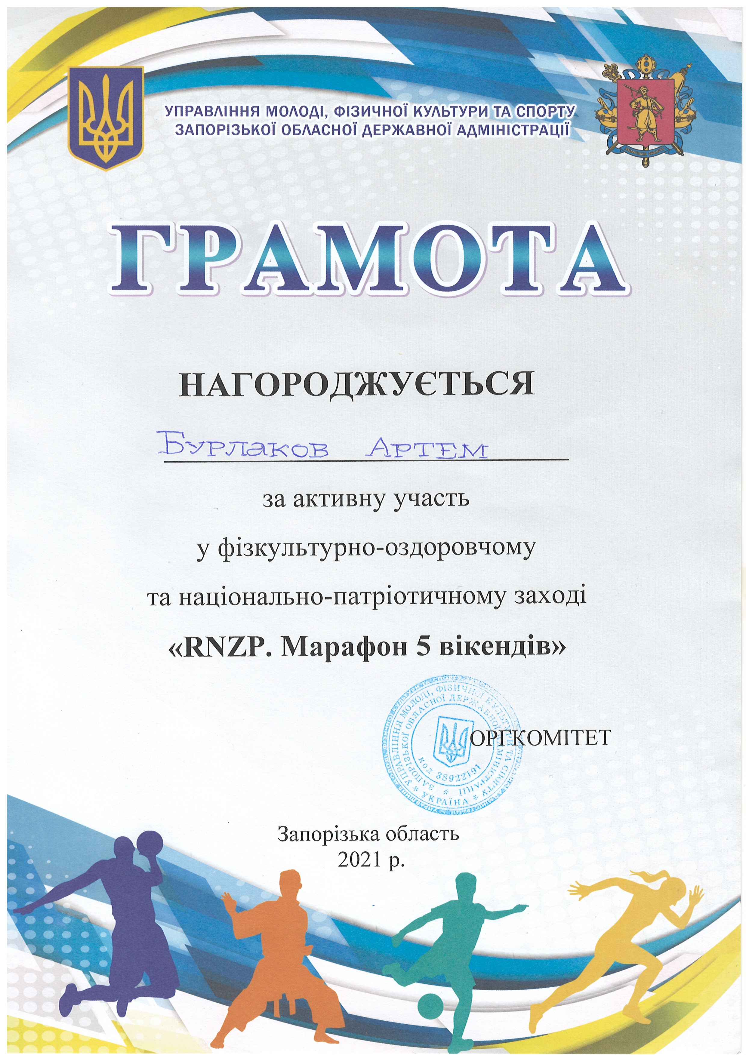 2. 22 травня 2021 року – участь збірної команди ТДАТУ з легкої атлетики в фізкультурно-оздоровчому, національно-патріотичному легкоатлетичному марафоні “RNZP. 5 вікендів” (територія національного історико-археологічного заповідника “Кам’яна Могила”). Взяли участь 9 студентів та 2 викладачів кафедри фізичного виховання і спорту: Сабіров Алішер (12 МН), Бубнова Вікторія (21 ТР), Бурлаков Артем (21 ЕЕ), Маркарова Ольга (11 ХТ), Чернишова Поліна (11 ГЗ), Токарев Олександр (31 АГ), Топольницький Георгій (11 ЕЕ), Прокопій Владислав (13 САІ), Ребрик Дмитро (11 АІ), старші викладачі МІЛАЄВ ОЛЕКСАНДР ІВАНОВИЧ та АРТЕМЕНКО ВОЛОДИМИР ВОЛОДИМИРОВИЧ. ФОТОЗВІТ – тиснути сюди. ГРАМОТА УЧАСТІ В ЗАХОДІ.