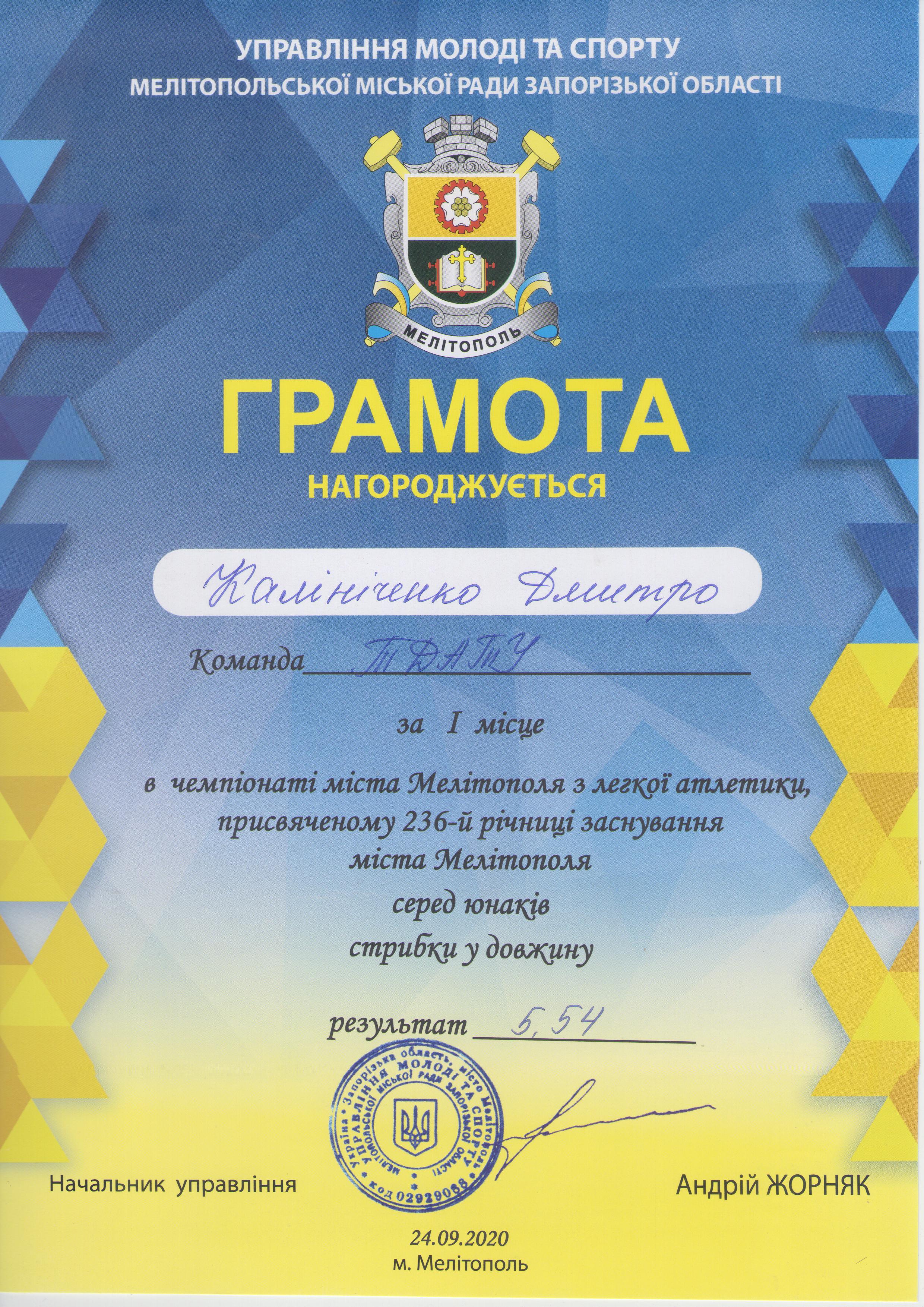 Калініченко Дмитро – 42 АІ (ІІ місце у стрибках у довжину з розбігу серед юнаків 2006 р.н. і старше) – ГРАМОТА
