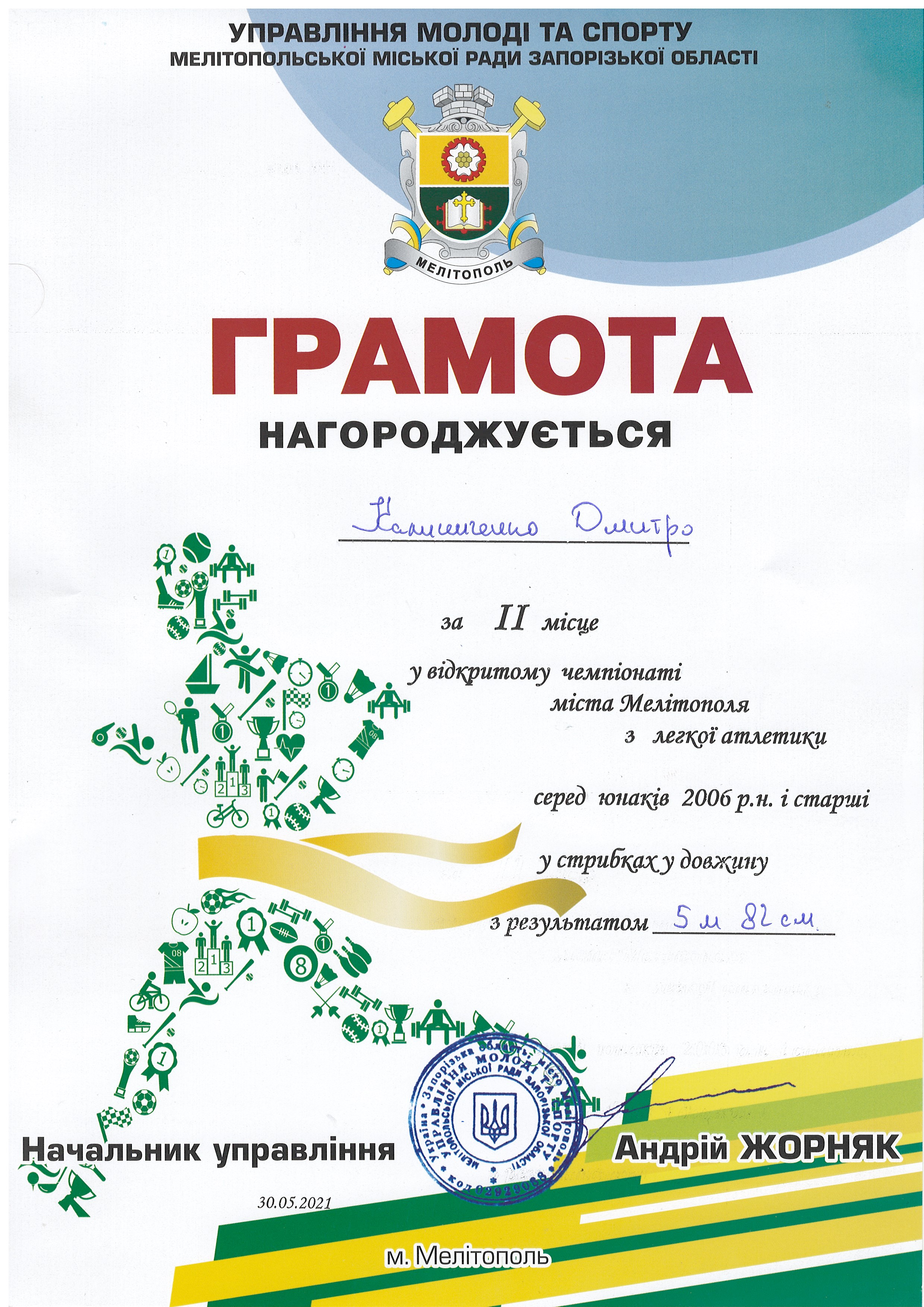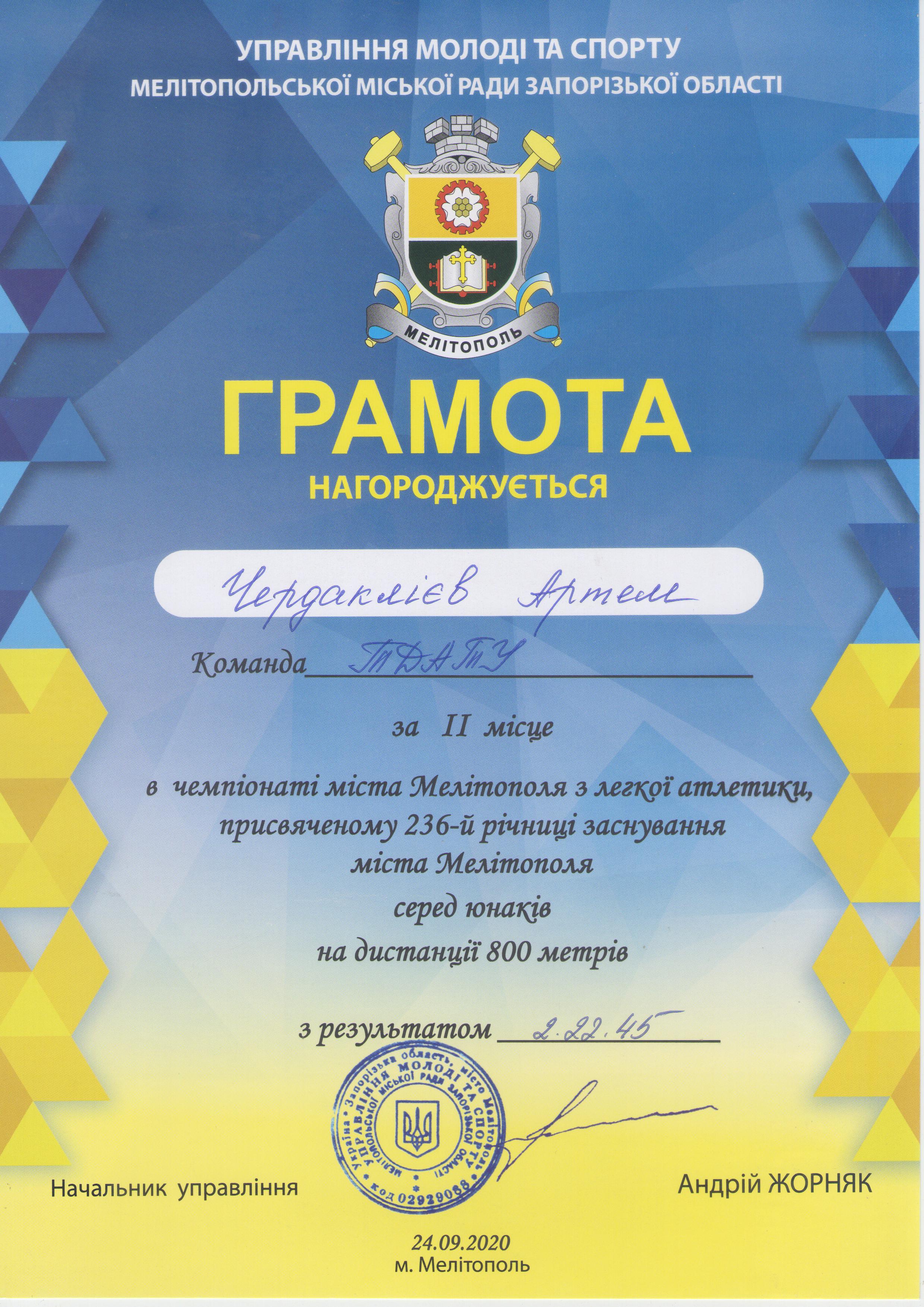 Чердаклієв Артем – 12 МБАГЗ (ІІ місце на дистанції 800 метрів серед юнаків) – ГРАМОТА