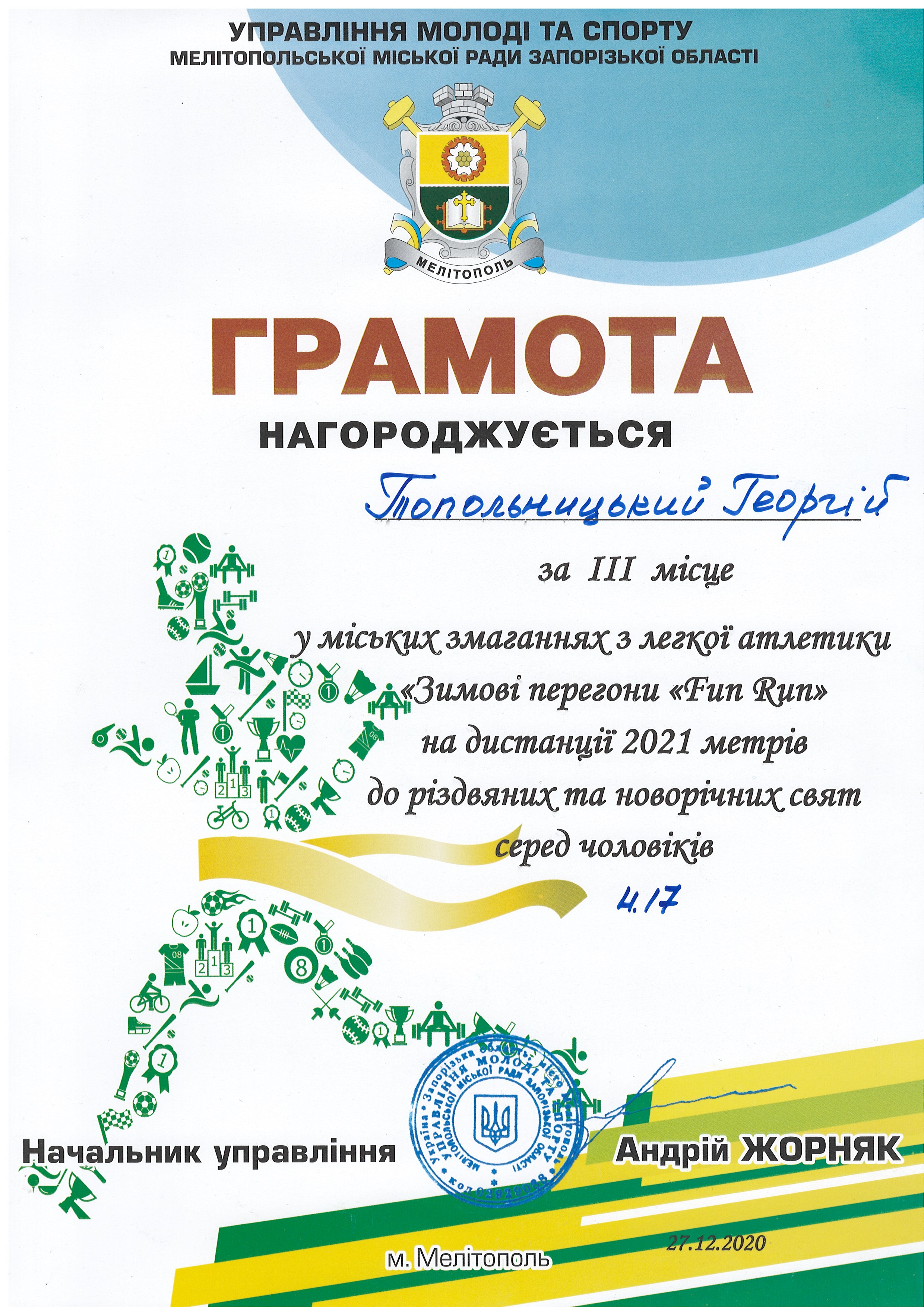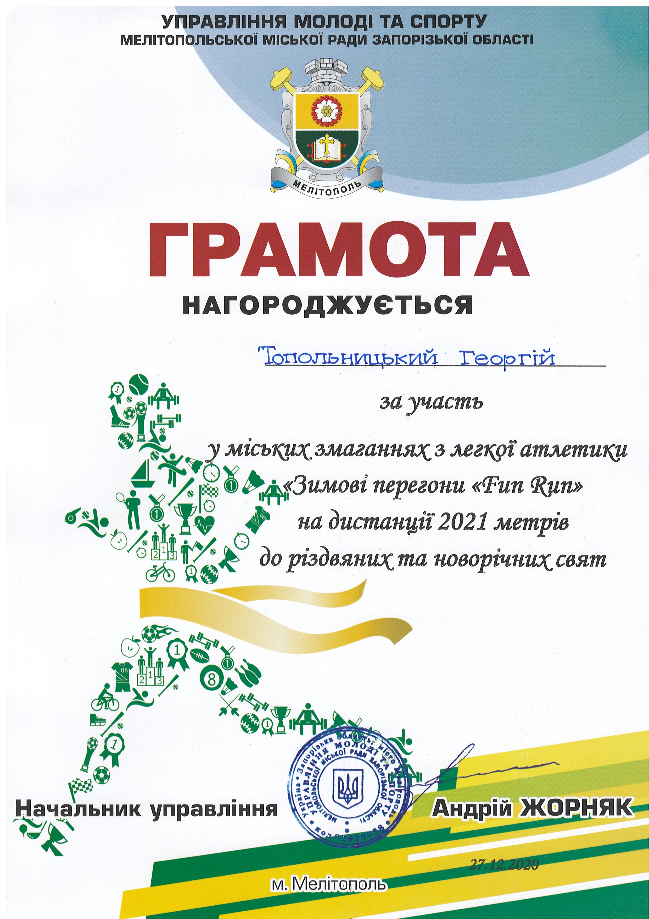 1. Міські змагання з легкої атлетики “Зимові перегони “Fun Run” на дистанції 2021 метрів до різдвяних та новорічних свят (м. Мелітополь, 27.12.2021 р.): Топольницький Георгій – 11 ЕЕ (ІІІ місце серед чоловіків) – ГРАМОТА ЗА УЧАСТЬ, ГРАМОТА ЗА ІІІ МІСЦЕ